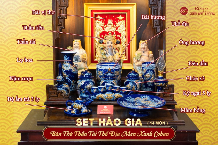 Phiên bản Hào Gia 14 món mang đến sự đầy đủ và cân xứng vượt trội. Bộ sản phẩm bao gồm 2 tượng Thần Tài và Thổ Địa, 1 bát hương, 3 chén thờ, 1 kỷ ngai 5 ly, 1 mâm bồng, 1 đĩa bày lễ, 1 ống hương, 1 đèn dầu, 1 nậm rượu, 1 bộ ấm trà 3 ly và 1 lọ hoa. Tổng thể 14 vật phẩm được thiết kế đồng bộ về họa tiết và màu men, tạo nên sự liên kết chặt chẽ, không rời rạc khi bài trí trên ban thờ.