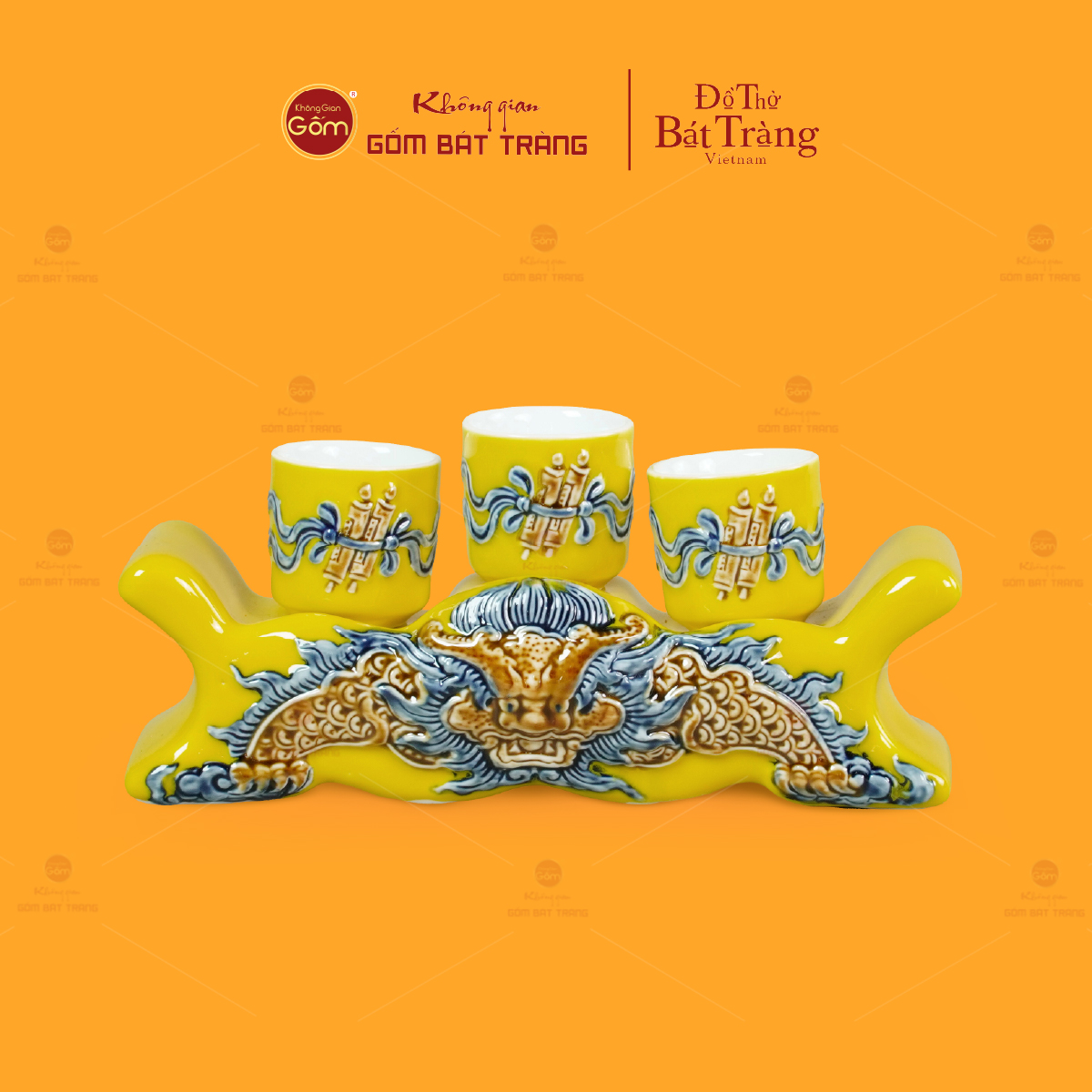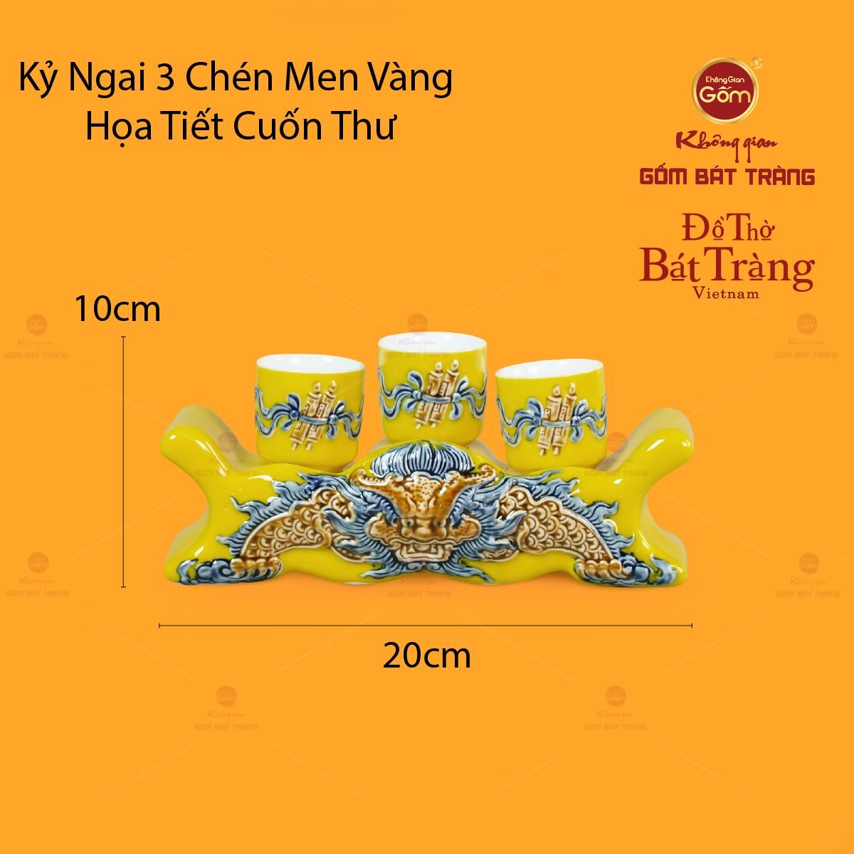 | Tên sản phẩm: | Bộ Kỷ Ngai 3 Chén Thờ Men Vàng Họa Tiết Cuốn Thư |