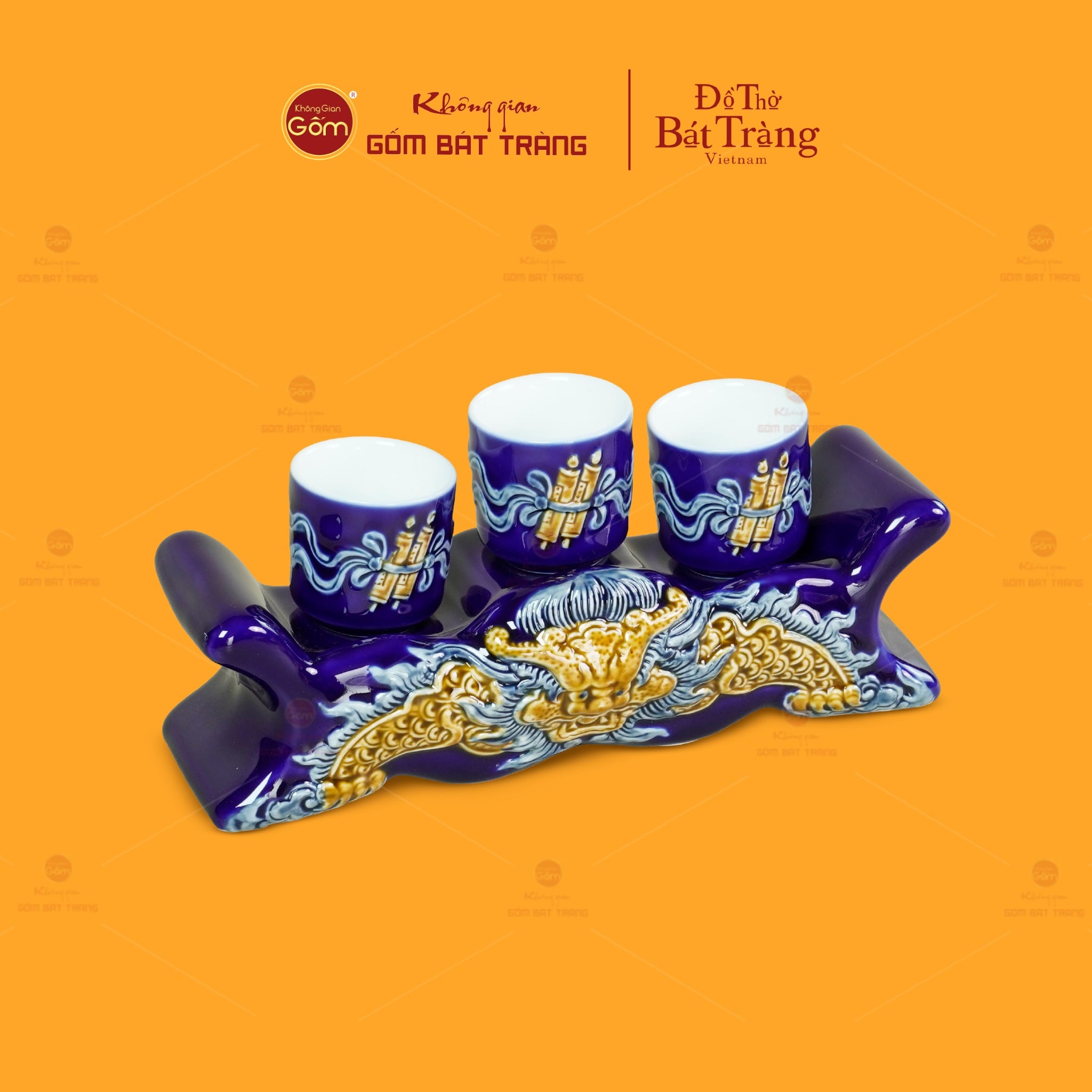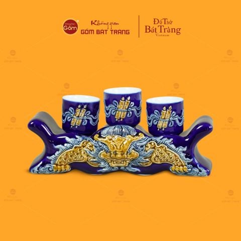 Sản phẩm được chế tác thủ công từ gốm sứ Bát Tràng, trải qua các công đoạn tạo hình, tráng men, vẽ họa tiết và nung ở nhiệt độ cao, giúp xương gốm chắc, bề mặt ổn định, phù hợp sử dụng lâu dài trong không gian thờ cúng. Kết cấu gồm một kỷ ngai liền khối và ba chén thờ đặt phía trên, tượng trưng cho tam tài thiên địa nhân, thể hiện sự hài hòa giữa con người và vũ trụ trong quan niệm tâm linh Á Đông.
