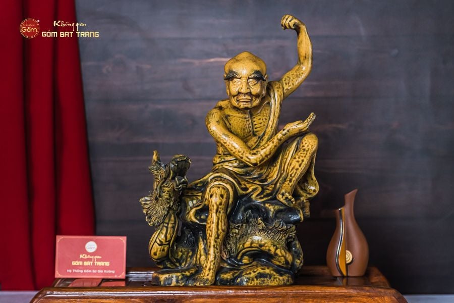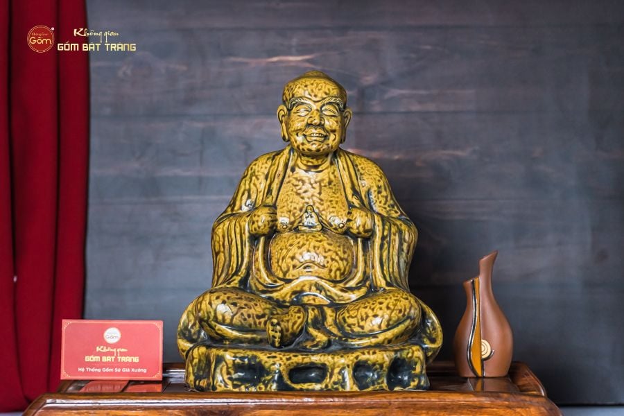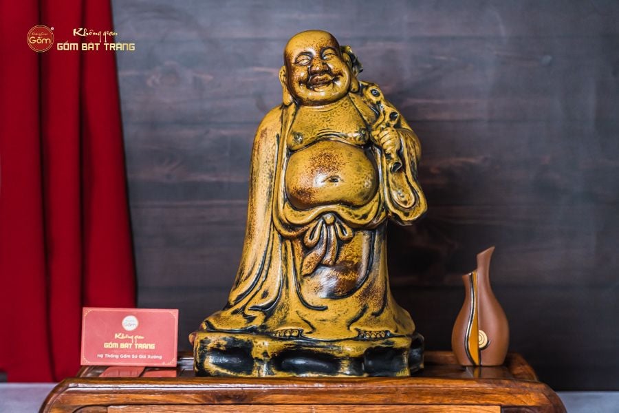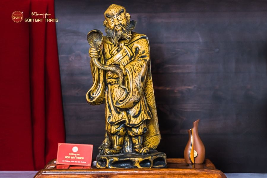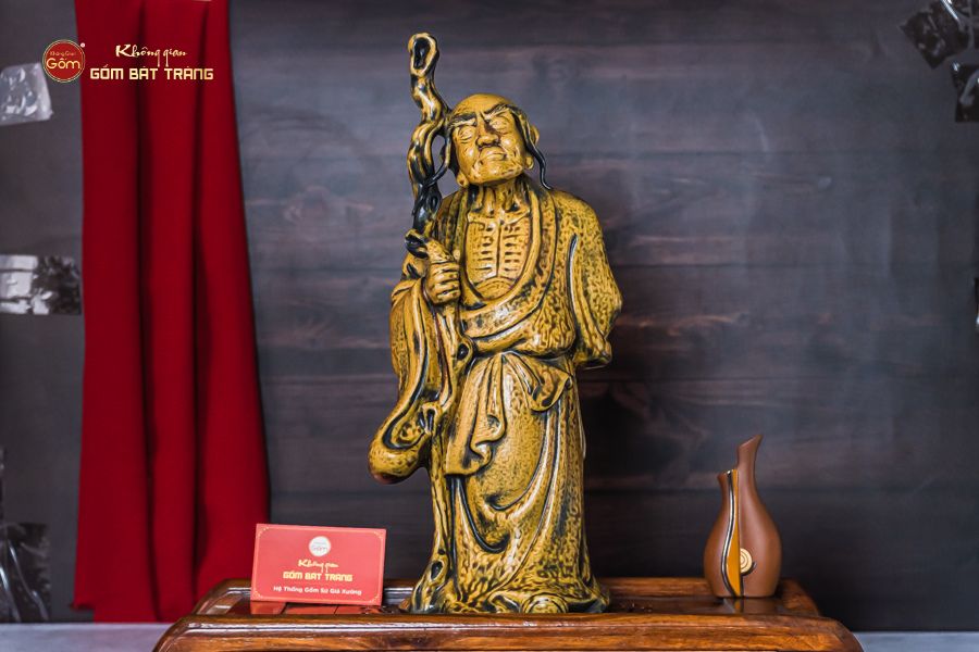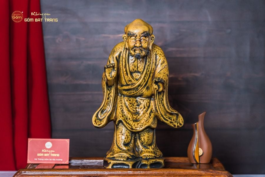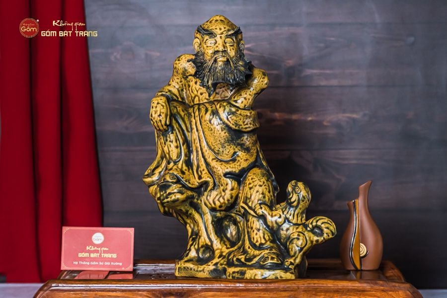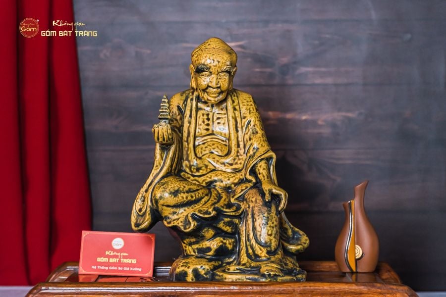 Men vàng cổ độc đáo: Sản phẩm được phủ lớp men rạn giả cổ màu vàng đặc trưng – vừa mang nét cổ kính, vừa tạo chiều sâu cho từng chi tiết trên tượng. Đây là dòng men cao cấp, thể hiện tay nghề lão luyện của nghệ nhân làng gốm.