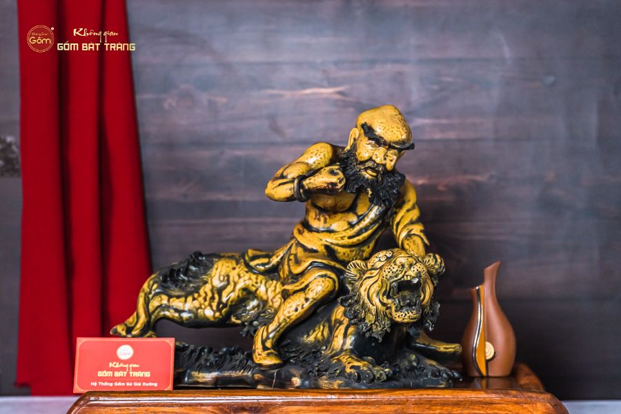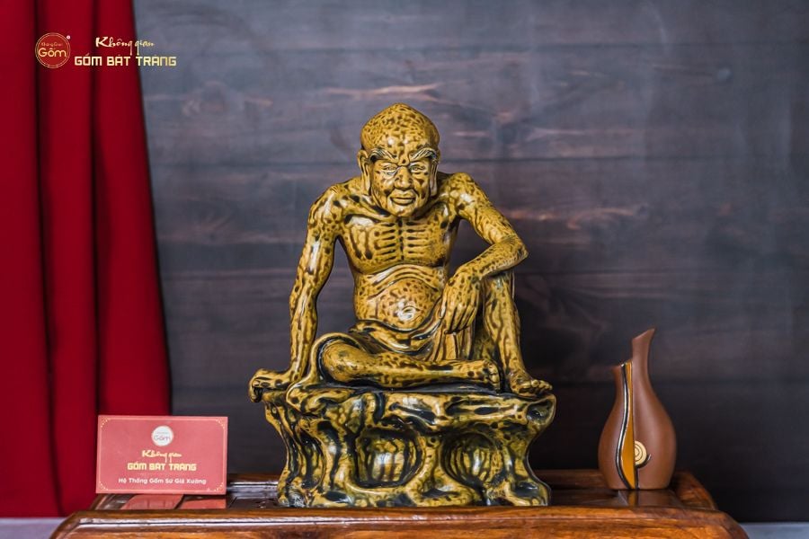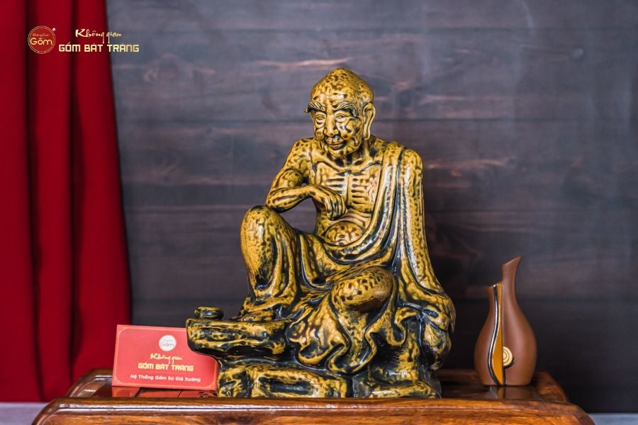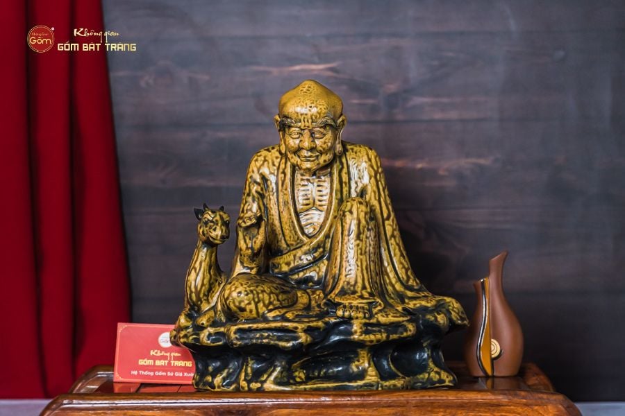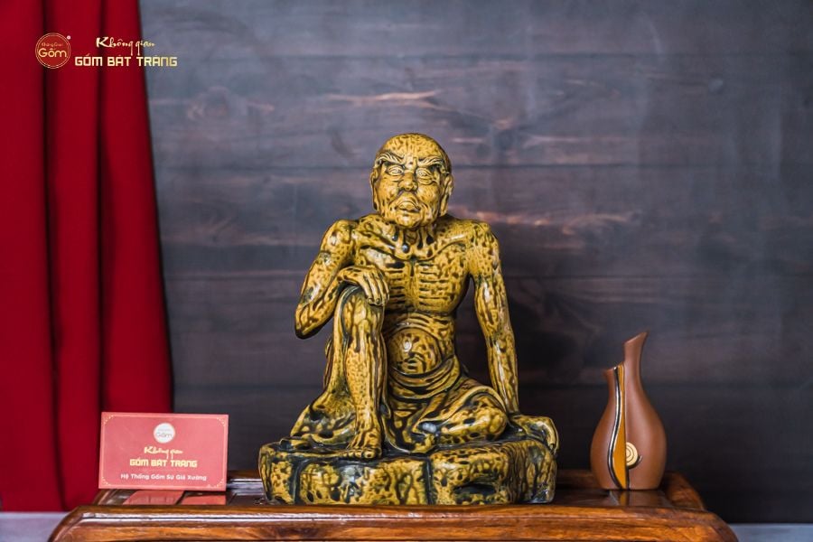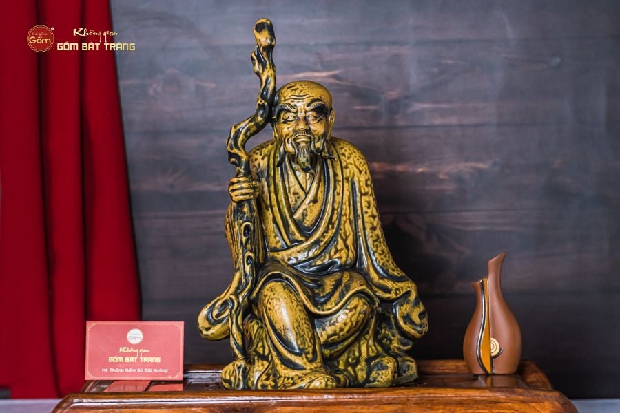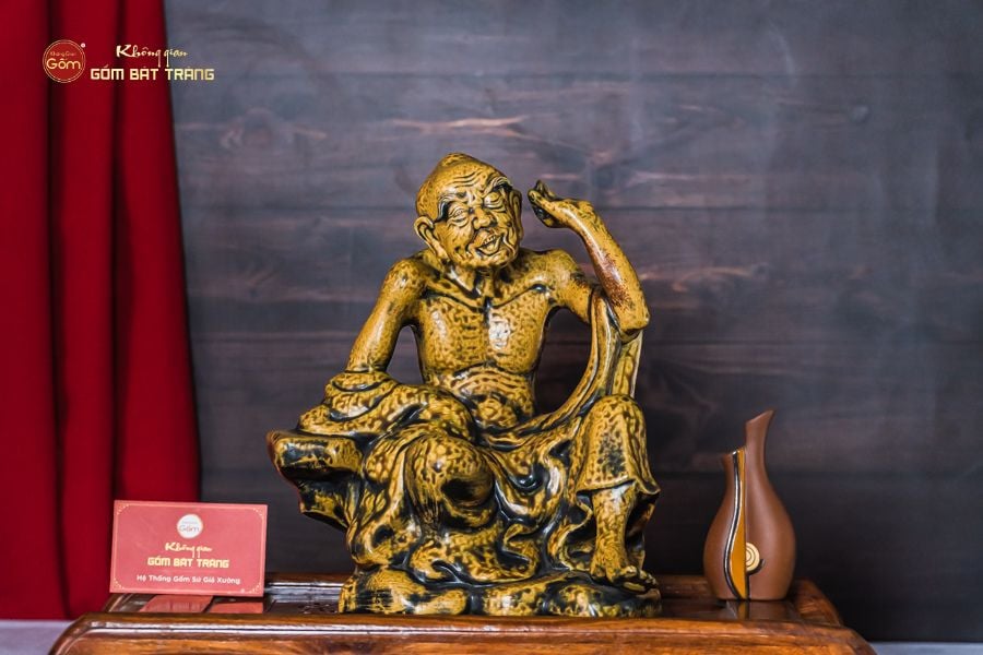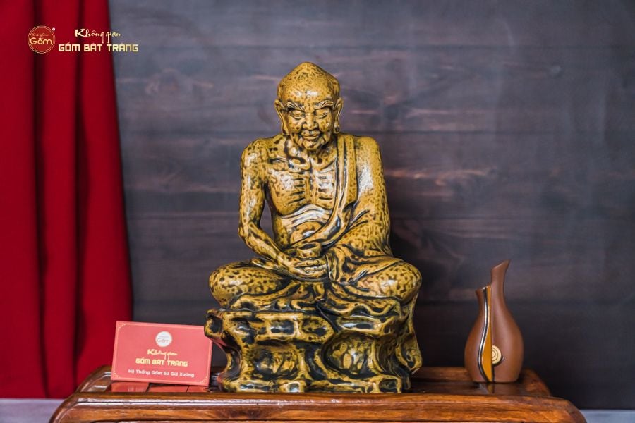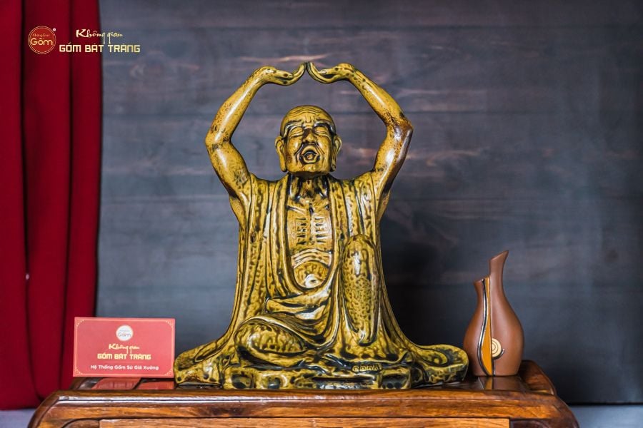 Men vàng cổ độc đáo: Sản phẩm được phủ lớp men rạn giả cổ màu vàng đặc trưng – vừa mang nét cổ kính, vừa tạo chiều sâu cho từng chi tiết trên tượng. Đây là dòng men cao cấp, thể hiện tay nghề lão luyện của nghệ nhân làng gốm.