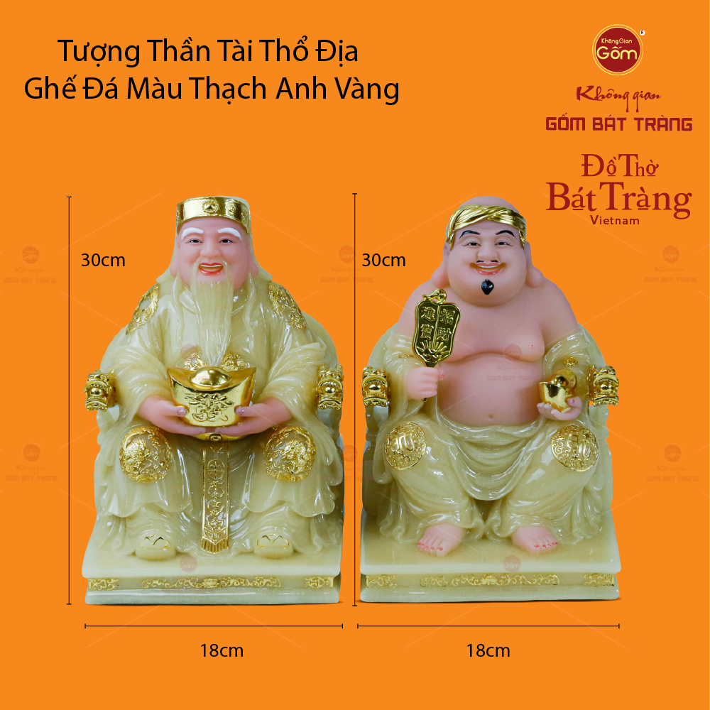 Trong đời sống tâm linh của người Việt, hình ảnh Thần Tài và Thổ Địa đã trở nên quen thuộc và gắn bó mật thiết, đặc biệt đối với những gia đình làm kinh doanh, buôn bán. Đây là hai vị thần mang đến tài lộc, sự sung túc và bình an cho gia chủ. Bộ Tượng Thần Tài Thổ Địa Ghế Rồng Màu Thạch Anh Vàng là một tác phẩm nghệ thuật đặc sắc được chế tác từ gốm sứ Bát Tràng, kết hợp khéo léo giữa yếu tố mỹ thuật và ý nghĩa phong thủy. Màu sắc thạch anh vàng sang trọng vừa tạo cảm giác ấm áp, vừa thể hiện sự giàu sang, thịnh vượng.