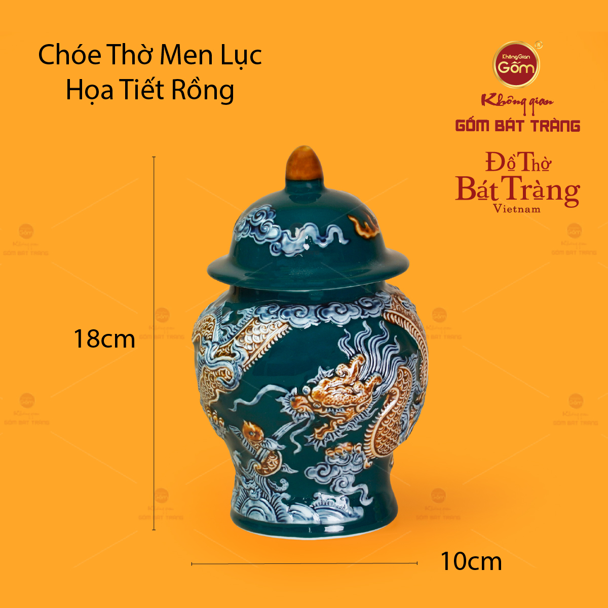 Chóe được chế tác hoàn toàn thủ công bởi những nghệ nhân làng gốm Bát Tràng giàu kinh nghiệm, mang đến từng đường nét tinh xảo và sống động. Phần thân chóe có dáng tròn đầy, tượng trưng cho sự viên mãn, sung túc. Lớp men lục phủ ngoài được pha chế từ khoáng chất tự nhiên, tạo hiệu ứng bóng nhẹ, mịn màng và bền màu theo thời gian. Màu lục dịu sâu vừa toát lên cảm giác trang trọng, vừa mang vẻ gần gũi, an hòa – rất phù hợp với không gian thờ tự truyền thống Việt.