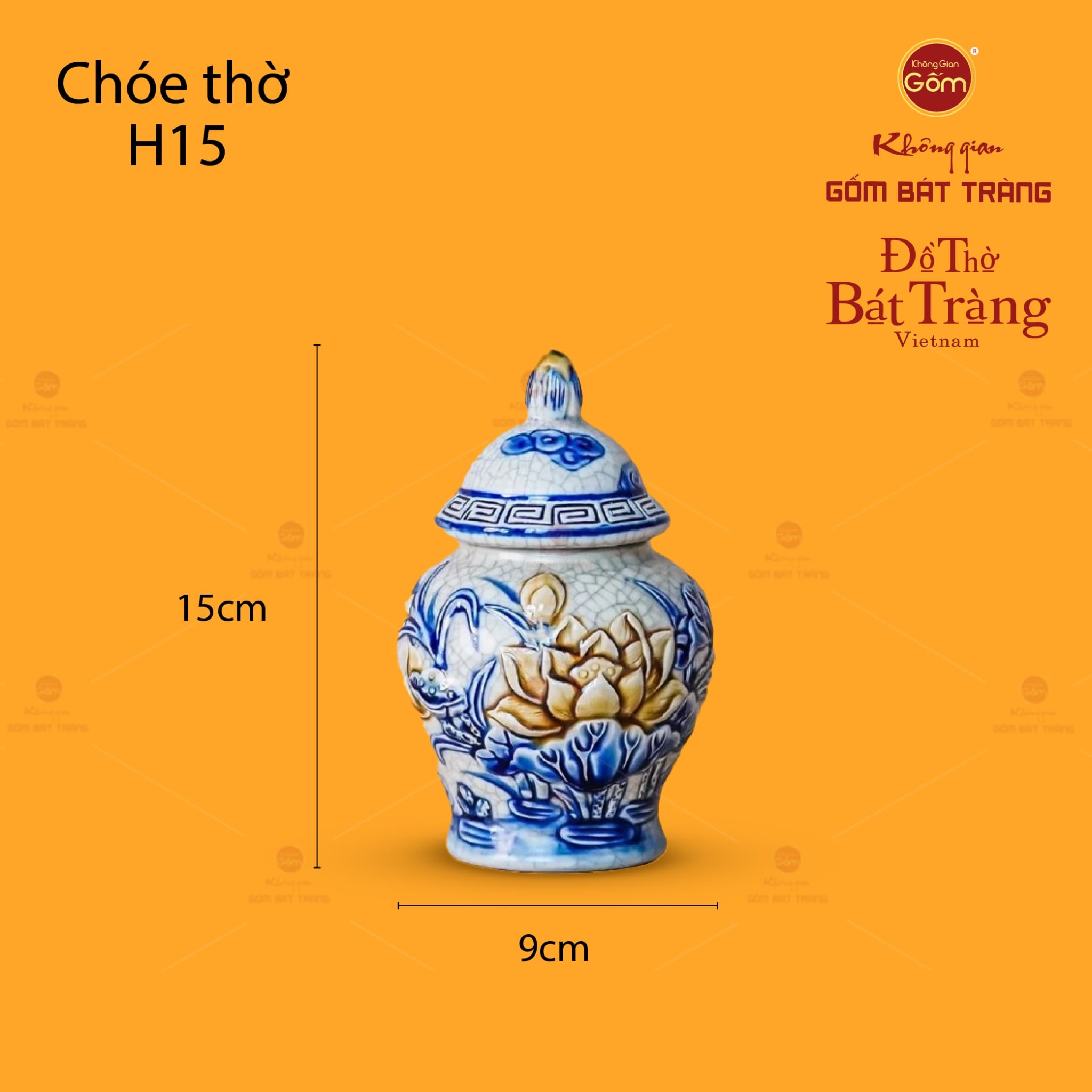 Về thiết kế họa tiết, chóe thờ nổi bật với họa tiết Hoa Sen được đắp nổi hoàn toàn thủ công trên thân. Những cánh sen mềm mại, thanh khiết đang bung nở, kết hợp với các chi tiết lá sen, nụ sen được thể hiện sống động, tạo nên một bức tranh thiên nhiên tĩnh lặng nhưng đầy sức sống. Phần nắp chóe cũng được chế tác tỉ mỉ với các hoa văn đồng bộ hoặc hình ảnh búp sen nhỏ, tạo nên một tổng thể hài hòa và cân đối. Sự phối màu giữa nền men rạn trắng ngà và sắc xanh lam đặc trưng của nước, lá sen, cùng tông màu vàng kem của hoa sen, tạo nên một tổng thể hài hòa, trang nghiêm và mang đậm nét văn hóa thờ cúng truyền thống Việt.