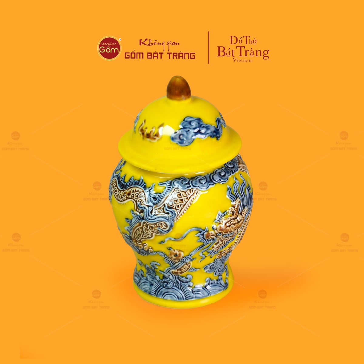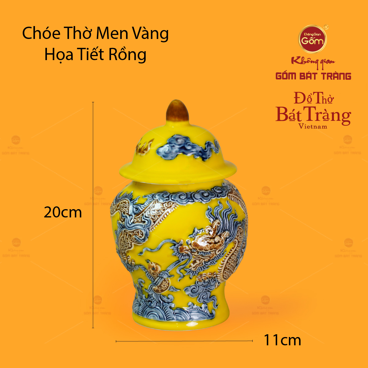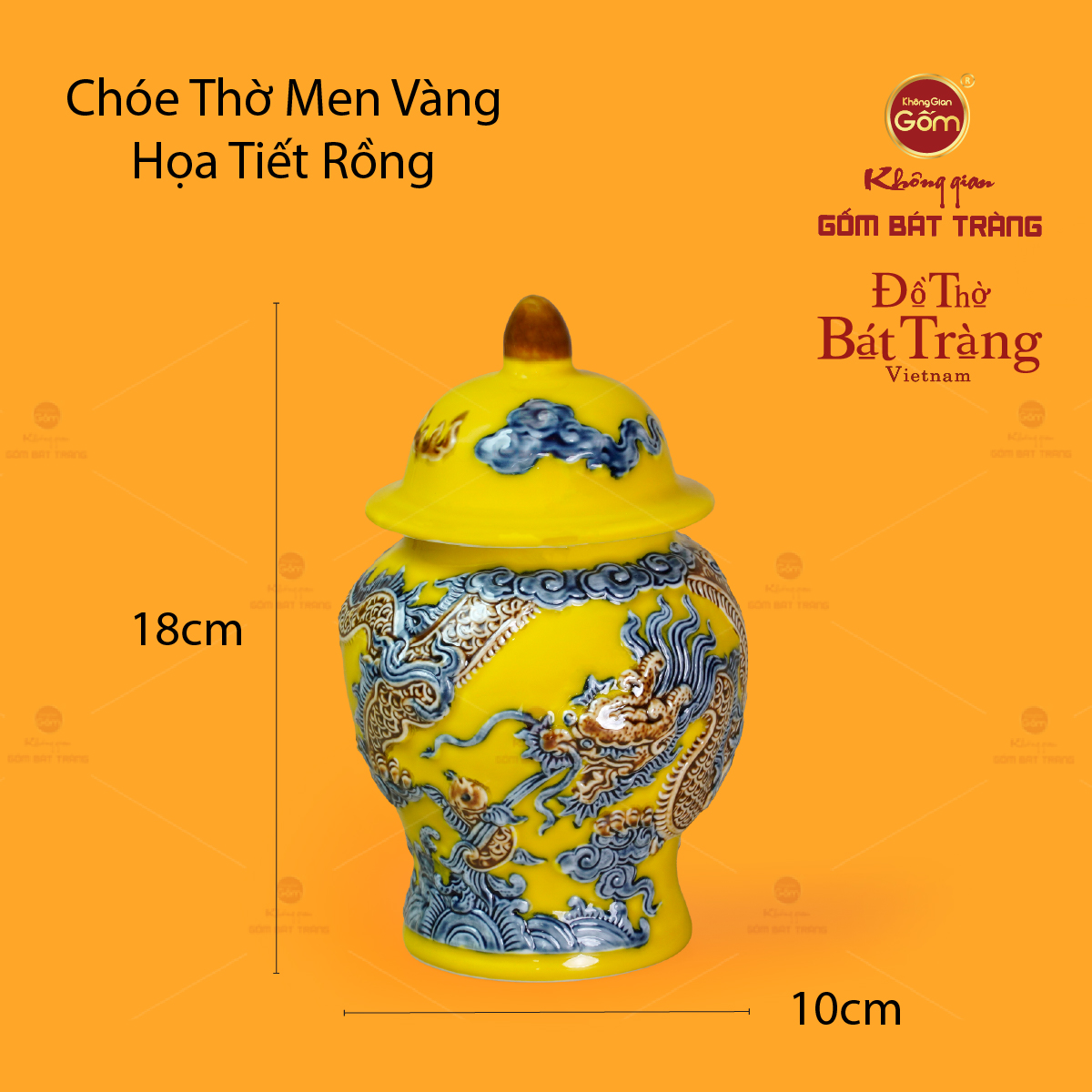 Tại Không Gian Gốm Bát Tràng, mỗi chiếc chóe là kết quả của hàng chục giờ lao động tỉ mỉ, trải qua quá trình tạo hình, tráng men, vẽ họa tiết và nung ở nhiệt độ cao. Nhờ kỹ thuật nung chuẩn xác, sản phẩm đạt độ bền vượt trội, không rạn nứt, giữ màu men và họa tiết sắc nét qua thời gian. Chóe Thờ Men Vàng Họa Tiết Cá Chép Hóa Rồng không chỉ là vật phẩm thờ cúng, mà còn là biểu trưng của mỹ học gốm Việt – nơi nghệ thuật và tâm linh giao hòa. Mỗi sản phẩm đều mang dấu ấn riêng, bởi toàn bộ họa tiết đều được vẽ tay, thể hiện sự tỉ mỉ và tâm huyết của người thợ.