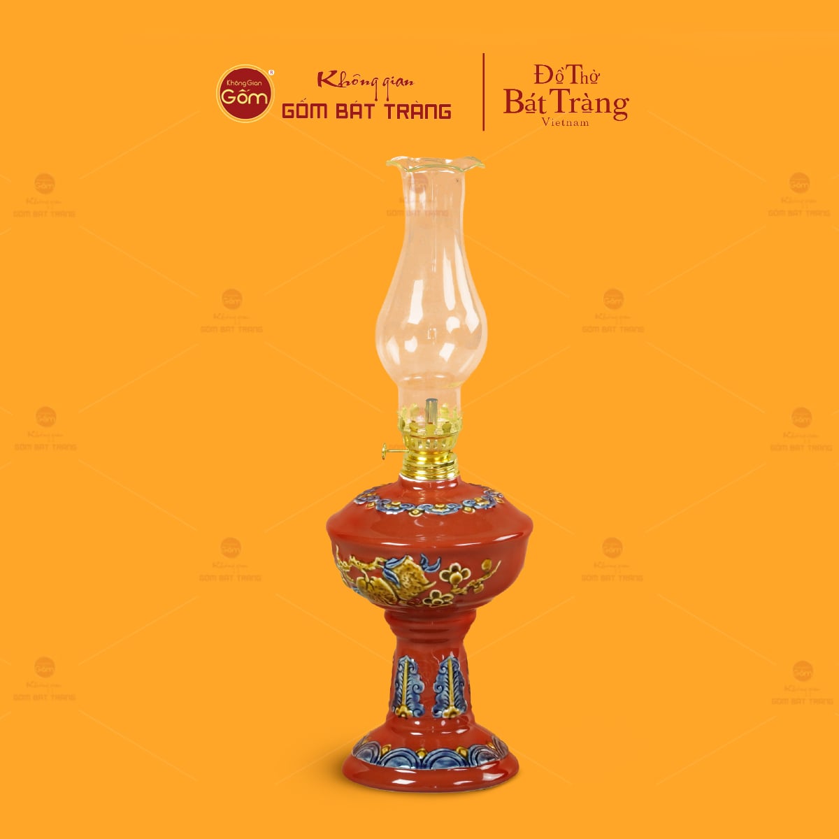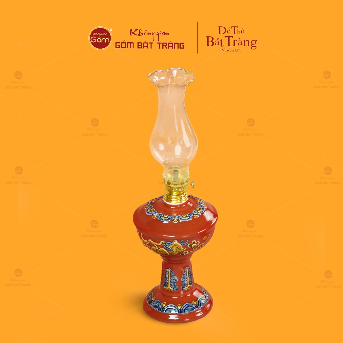 Phần ống thủy tinh phía trên được thiết kế trong suốt, giúp ánh lửa dầu tỏa sáng ổn định, không quá gắt, tạo nên nguồn sáng dịu nhẹ. Khi thắp đèn, ánh lửa kết hợp cùng sắc men đỏ tạo nên hiệu ứng ấm áp, giữ cho không gian thờ luôn có sinh khí, thể hiện sự chăm lo, thành kính của con cháu đối với tổ tiên.