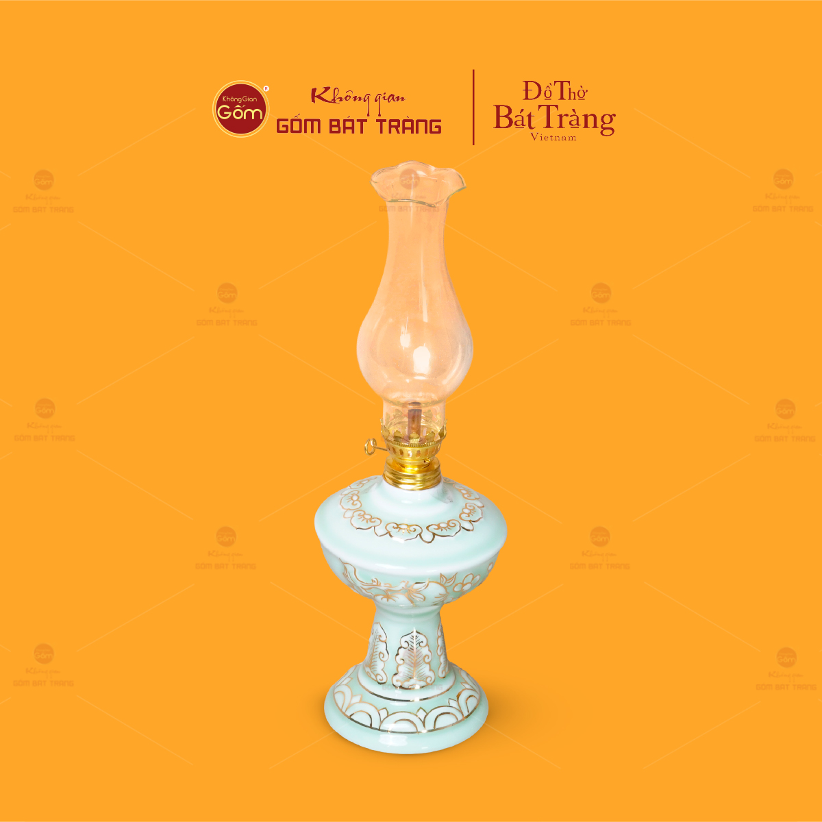 Sản phẩm được chế tác thủ công từ gốm sứ Bát Tràng, trải qua các công đoạn tạo hình, tráng men, vẽ họa tiết và nung ở nhiệt độ cao, giúp xương gốm chắc, bề mặt ổn định và bền màu theo thời gian. Đèn có kết cấu cân đối gồm phần chân đế vững chãi, thân đèn bo tròn mềm mại và bầu chứa dầu phía trên, kết hợp cùng ống thủy tinh trong suốt, thuận tiện cho việc sử dụng trong các nghi lễ thờ cúng hằng ngày và dịp lễ tiết.