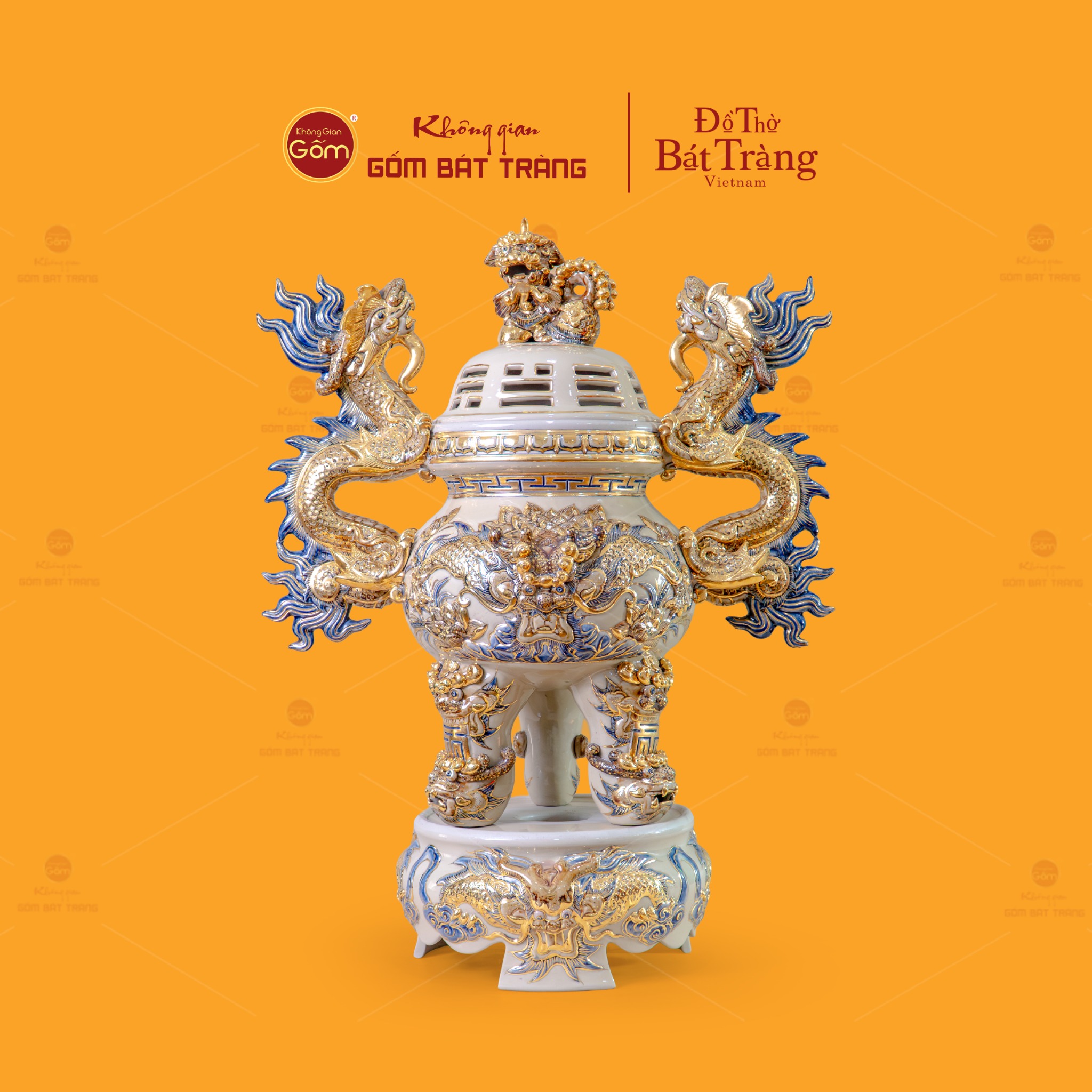 Đỉnh hương được chế tác hoàn toàn thủ công từ chất liệu gốm sứ Bát Tràng cao cấp, trải qua quá trình nung ở nhiệt độ cao giúp sản phẩm đạt độ bền chắc, khả năng chịu nhiệt tốt và giữ được vẻ đẹp lâu dài theo thời gian. Toàn bộ thân đỉnh phủ lớp men hoàng tộc với sắc vàng kem thanh nhã, tạo nền tôn lên các chi tiết vẽ vàng nổi bật.