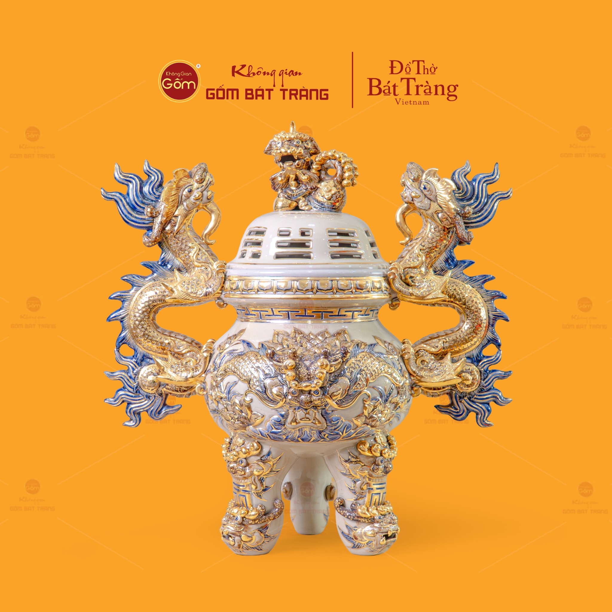 Đỉnh Hương Thờ Men Hoàng Tộc Vẽ Vàng là hiện thân của vẻ đẹp uy nghi và giá trị tâm linh sâu sắc trong không gian thờ cúng truyền thống. Sản phẩm được chế tác từ gốm sứ Bát Tràng với lớp men hoàng tộc trang nhã kết hợp cùng họa tiết Thanh Long vẽ vàng tinh xảo, tạo nên tổng thể sang trọng và linh thiêng. Không chỉ là vật phẩm thờ tự, đỉnh hương còn là biểu tượng của sự kết nối giữa con cháu và tổ tiên, góp phần giữ gìn nét đẹp văn hóa và mang đến nguồn năng lượng an hòa cho gia đình.