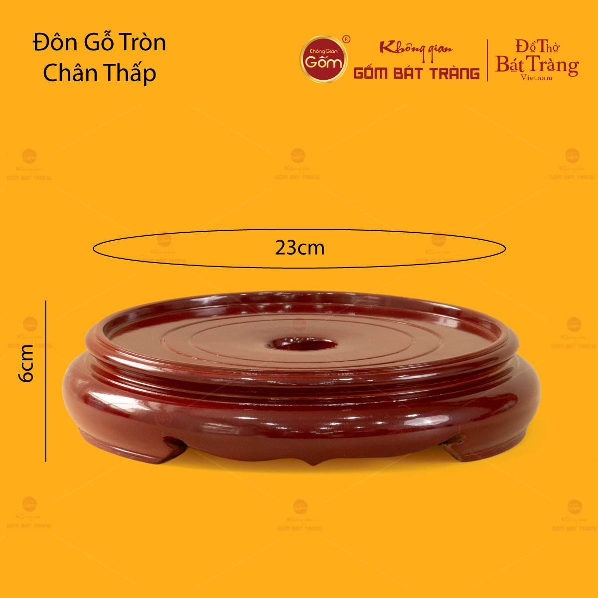 Đôn gỗ tròn chân thấp có kích thước đa dạng (ví dụ: đường kính 23cm), phù hợp với nhiều loại vật phẩm gốm sứ khác nhau, từ các kích cỡ bình hoa nhỏ đến các cặp Lộc Bình lớn. Đôn gỗ là giải pháp hoàn hảo để nâng tầm vật phẩm gốm sứ, tạo sự đồng bộ và trang trọng cho không gian trưng bày.