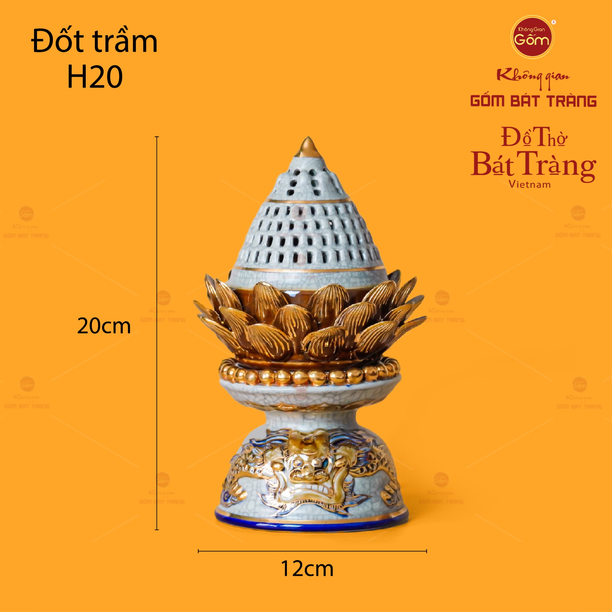 Hiện nay, sản phẩm được chế tác và phân phối bởi Không Gian Gốm Bát Tràng, một địa chỉ uy tín, nơi hội tụ và kế thừa những tinh hoa của nghệ thuật gốm sứ thủ công truyền thống Việt Nam. Với sự tỉ mỉ và trau chuốt trong từng công đoạn sản xuất, từ khâu tạo dáng, nước men đến các họa tiết vẽ vàng tinh xảo, Đốt Trầm Hoa Sen Men Rạn Vẽ Vàng không chỉ là một món đồ tâm linh, mà còn là một tác phẩm nghệ thuật đầy giá trị. Đây xứng đáng là sự lựa chọn hoàn hảo cho những ai yêu mến và trân trọng vẻ đẹp dịu dàng, yên tĩnh, và chân thành của gốm Bát Tràng. Sản phẩm đặc biệt phù hợp để đặt tại vị trí trang nghiêm như trung tâm bàn thờ, bên cạnh bát hương linh thiêng, nhằm tạo điểm nhấn hài hòa và thanh tịnh cho không gian thờ cúng. Bên cạnh đó, Đốt Trầm Hoa Sen Men Rạn Vẽ Vàng cũng có thể được sử dụng như một vật phẩm trang trí riêng biệt trong những không gian thiền định hoặc phòng trà thư giãn. Đây chính là nơi con người có thể lặng lẽ hồi tưởng, tìm về sự cân bằng và an yên qua làn khói trầm nhè nhẹ, mỏng manh nhưng đầy chân thật, giúp nuôi dưỡng tâm hồn và thăng hoa cảm xúc.