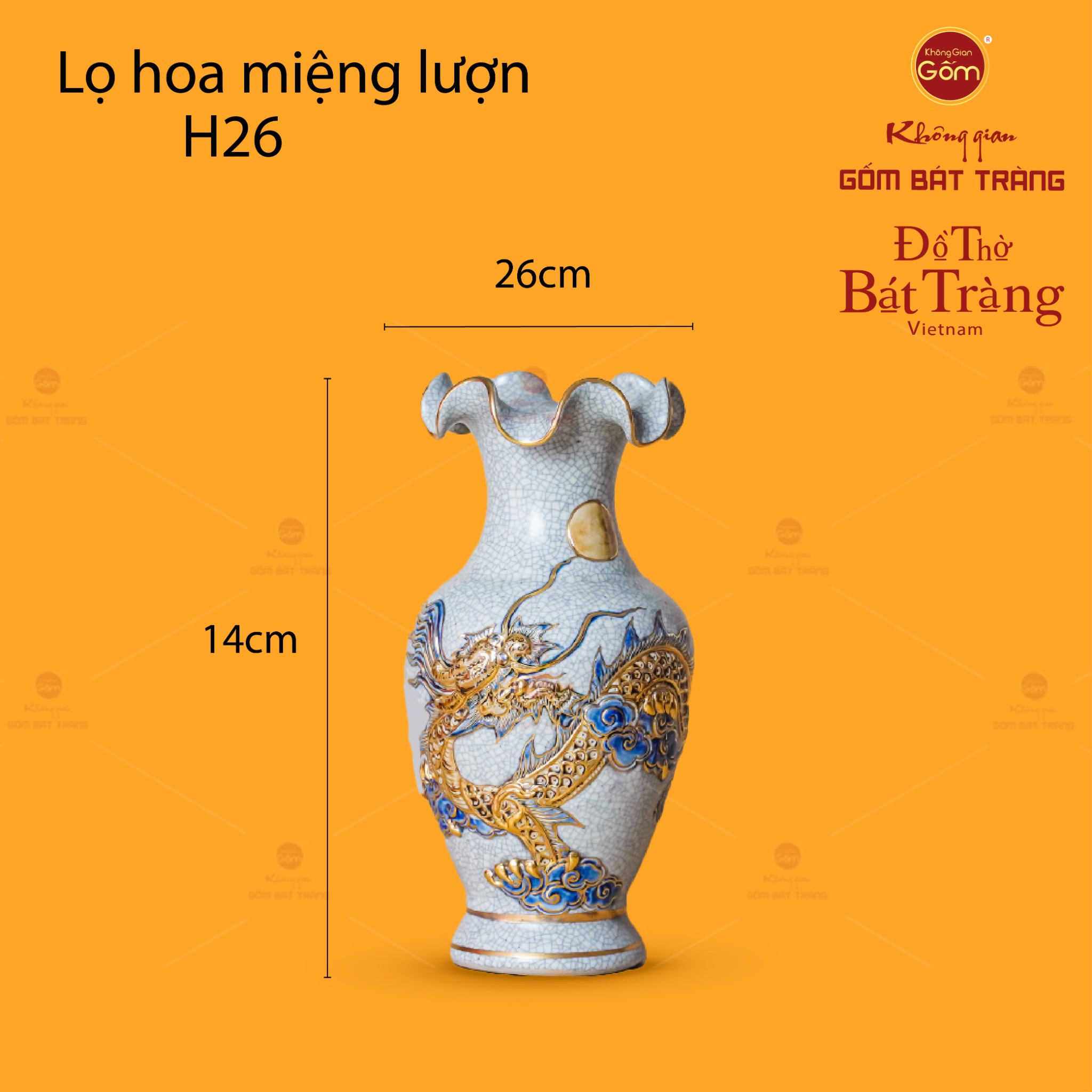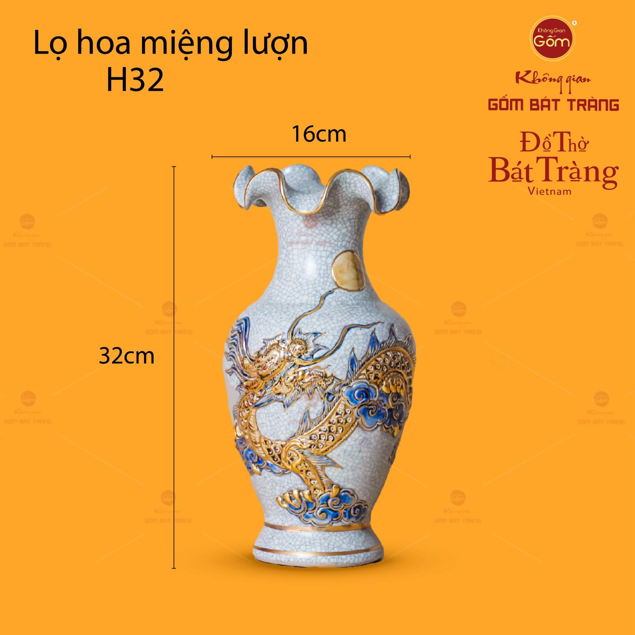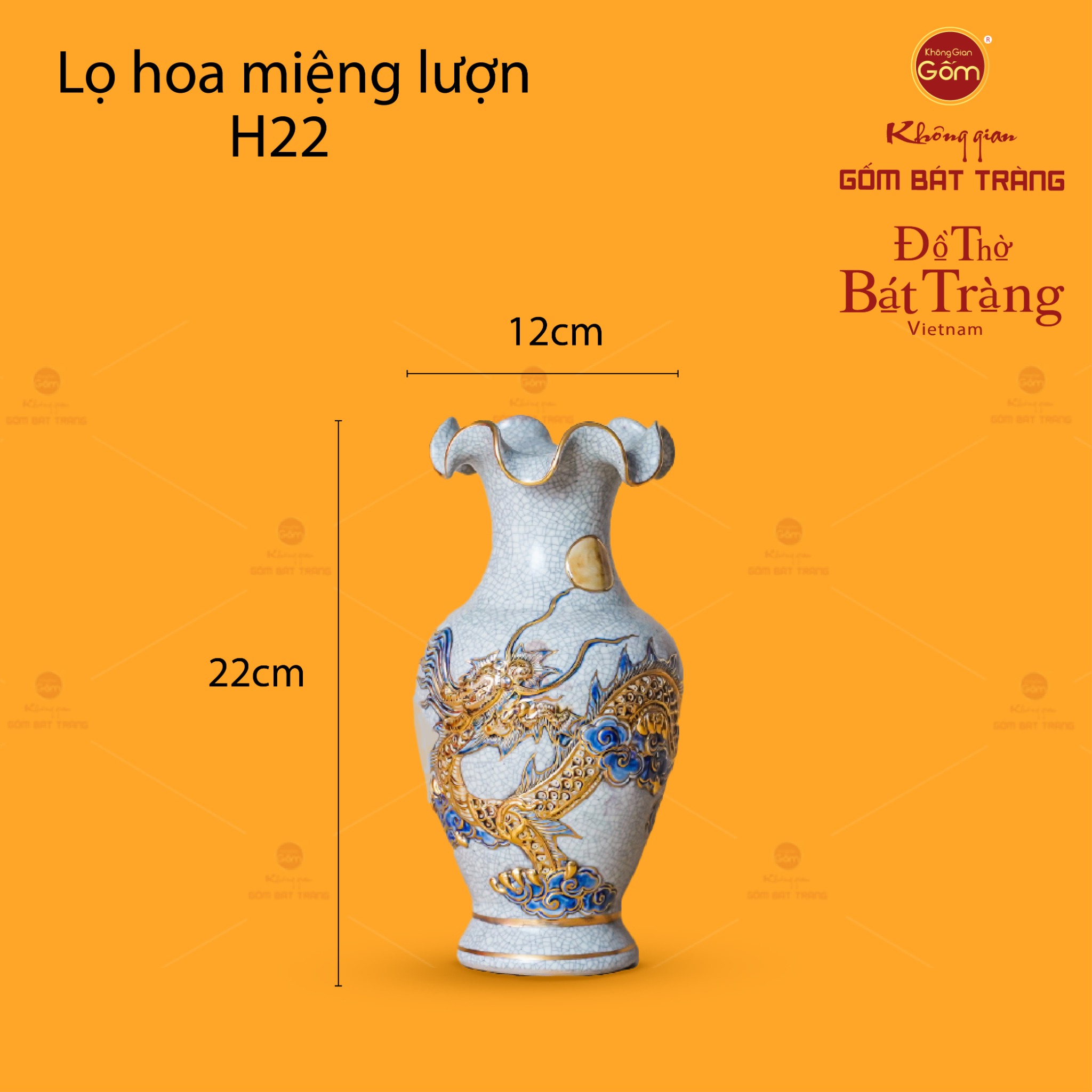 Lọ Hoa Miệng Lượn Rồng Chầu Nhật Men Rạn Vẽ Vàng là một sản phẩm tiêu biểu thuộc dòng đồ thờ cúng cao cấp, mang đậm dấu ấn của sự kết hợp hài hòa giữa nghệ thuật chế tác truyền thống lâu đời và sự sáng tạo tinh xảo đặc trưng của làng gốm Bát Tràng. Đây không chỉ đơn thuần là một chiếc lọ hoa thờ cúng mà còn là tác phẩm nghệ thuật đầy ý nghĩa. Điểm nhấn của chiếc lọ nằm ở phần miệng lượn sóng mềm mại, tạo nên sự độc đáo và khác biệt, cùng họa tiết rồng chầu mặt trời biểu trưng cho quyền uy và sức mạnh tối thượng. Lớp men rạn mang sắc thái cổ điển, gợi lên vẻ đẹp trang nghiêm, cổ kính, kết hợp cùng kỹ thuật vẽ vàng thủ công tỉ mỉ càng làm tăng thêm giá trị thẩm mỹ và nghệ thuật cho sản phẩm. Không chỉ là vật phẩm phục vụ nghi lễ tâm linh, chiếc lọ hoa này còn tượng trưng cho sự linh thiêng, phúc lộc dồi dào và ý niệm về sự bền bỉ, trường tồn theo thời gian.