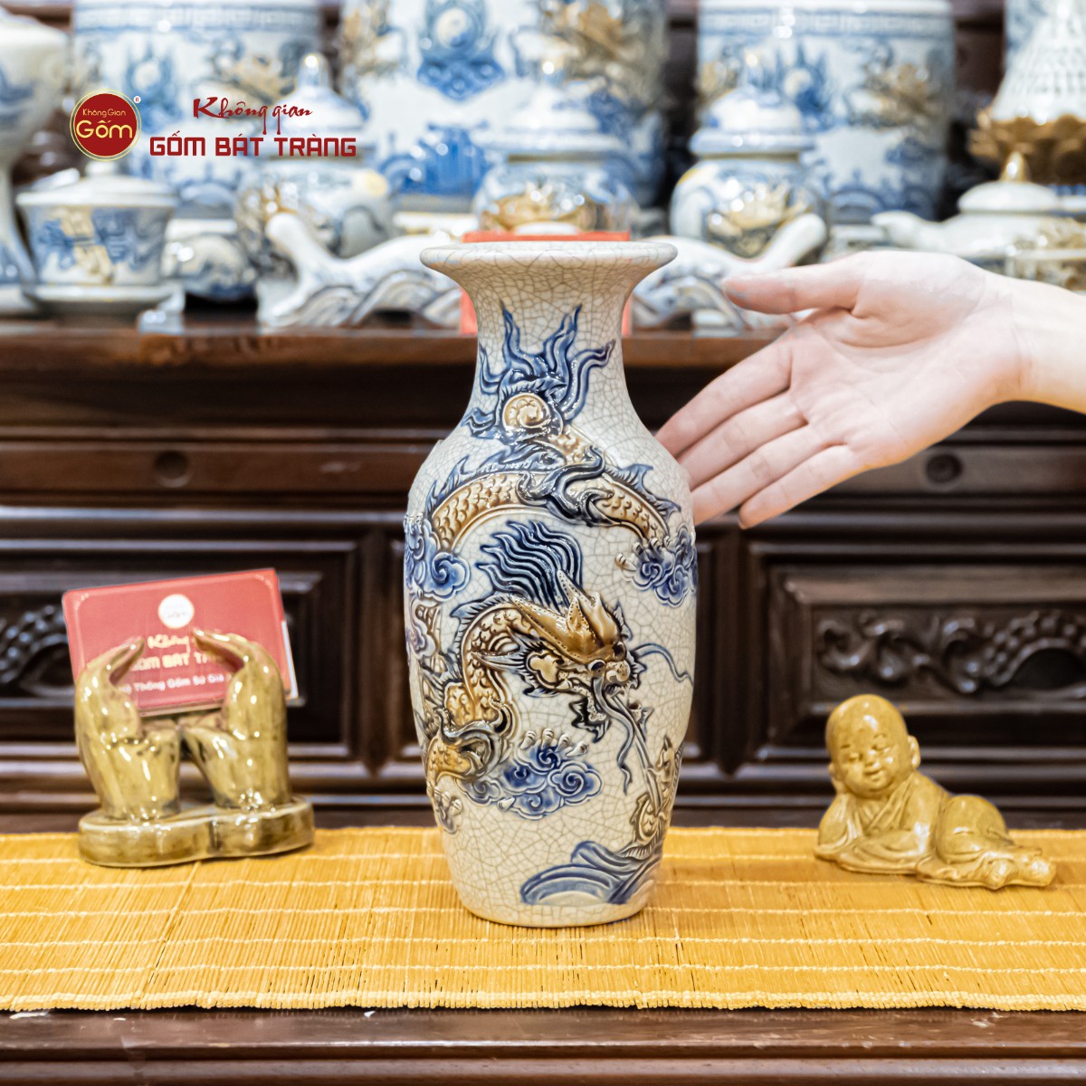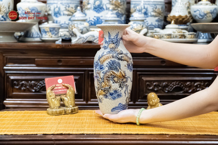 Điểm đặc trưng làm nên giá trị nghệ thuật và sự độc đáo không thể nhầm lẫn của lọ hoa chính là lớp men rạn cổ truyền của gốm sứ Bát Tràng. Lớp men này được tạo ra một cách tự nhiên và có chủ đích trong quá trình nung, khi xương gốm và men có độ co giãn khác nhau, tạo nên những vết rạn li ti tựa như những đường vân mạng nhện tinh xảo, ẩn hiện dưới lớp men bóng. Những vết rạn này không hề ảnh hưởng đến độ bền hay chất lượng của sản phẩm mà ngược lại, chúng mang đến vẻ đẹp cổ kính, trầm mặc, chiều sâu và một nét "thời gian" rất riêng cho từng tác phẩm. Điều này đồng nghĩa với việc mỗi chiếc lọ hoa bạn sở hữu là một tác phẩm độc bản, không trùng lặp, mang dấu ấn riêng biệt, thể hiện sự tinh túy và kinh nghiệm của nghề gốm cha ông. Màu men rạn thường là trắng ngà hoặc xám tro, tạo nên phông nền hoàn hảo, làm nổi bật các họa tiết màu xanh lam và vàng đồng.