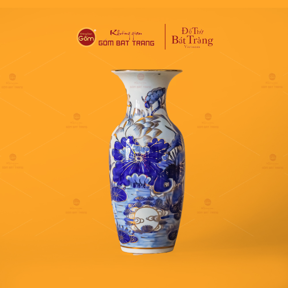 Lọ hoa thờ là vật phẩm không thể thiếu trên bàn thờ, tượng trưng cho sự tôn kính, lòng thành và mong muốn mang đến sự tươi mới, sinh khí cho không gian thờ tự. Hoa sen – biểu tượng của sự thanh cao, thuần khiết và hướng thiện – được thể hiện qua họa tiết vẽ vàng trên nền men lam, mang ý nghĩa phong thủy sâu sắc, giúp thu hút vượng khí, tài lộc và bình an cho gia đình.