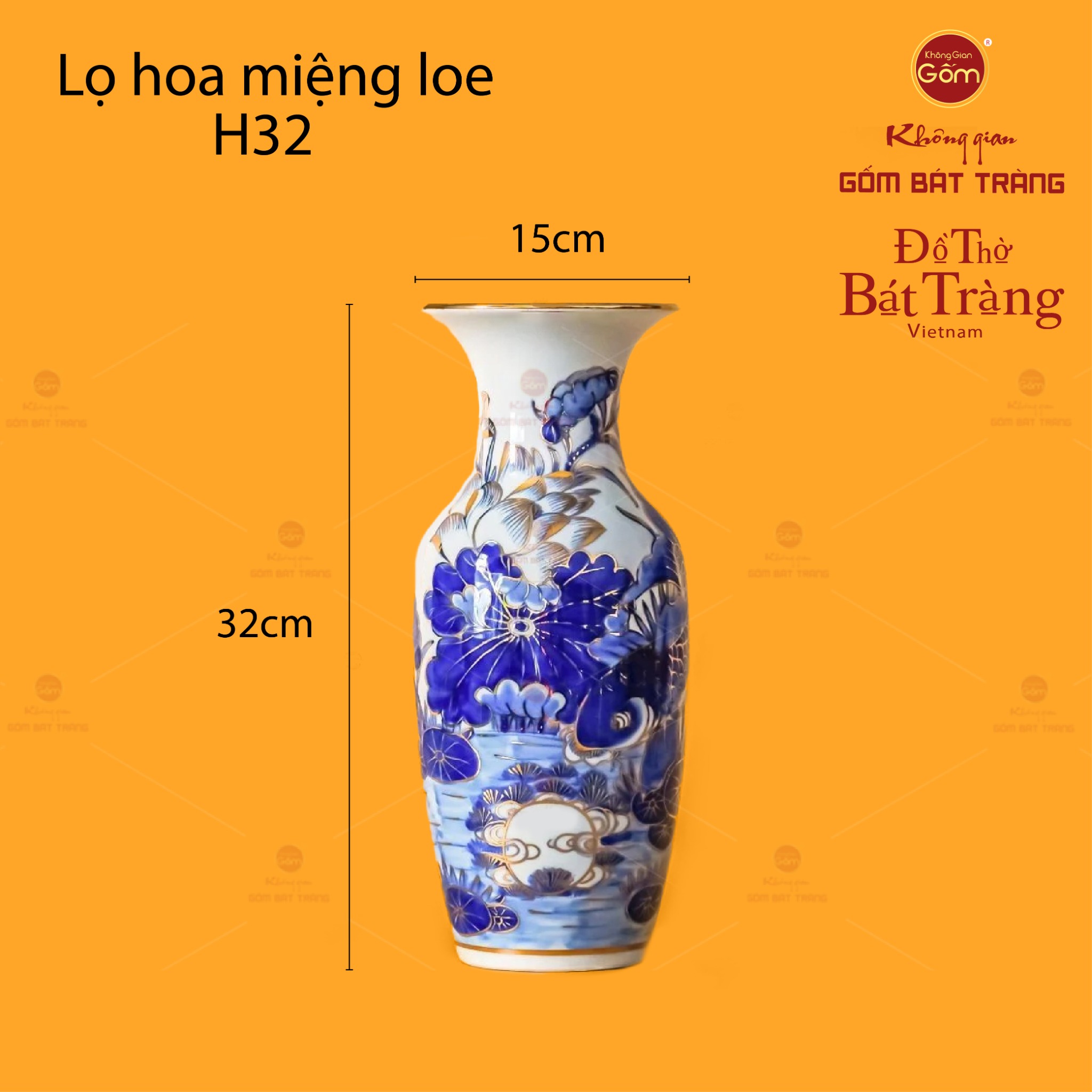 Lọ Hoa Thờ Miệng Loe Men Lam Vẽ Vàng Họa Tiết Hoa Sen là sản phẩm gốm sứ cao cấp được chế tác hoàn toàn thủ công tại làng nghề truyền thống Bát Tràng. Sản phẩm được làm từ chất liệu gốm sứ tuyển chọn, nung ở nhiệt độ trên 1300 độ C, đảm bảo độ bền chắc, khả năng chịu nhiệt tốt và giữ màu men sáng bóng lâu dài.