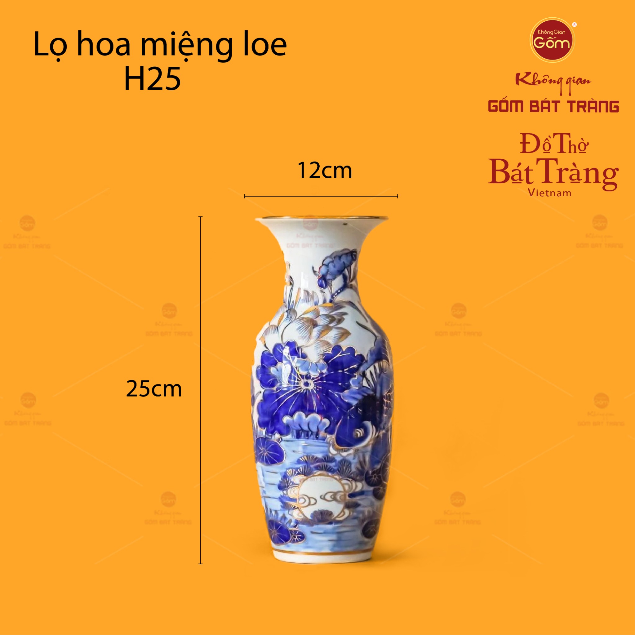 | Tên sản phẩm: | Lọ Hoa Thờ Miệng Loe Men Lam Vẽ Vàng Họa Tiết Hoa Sen |