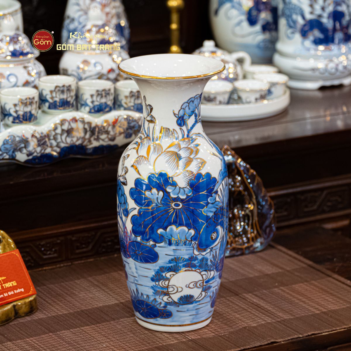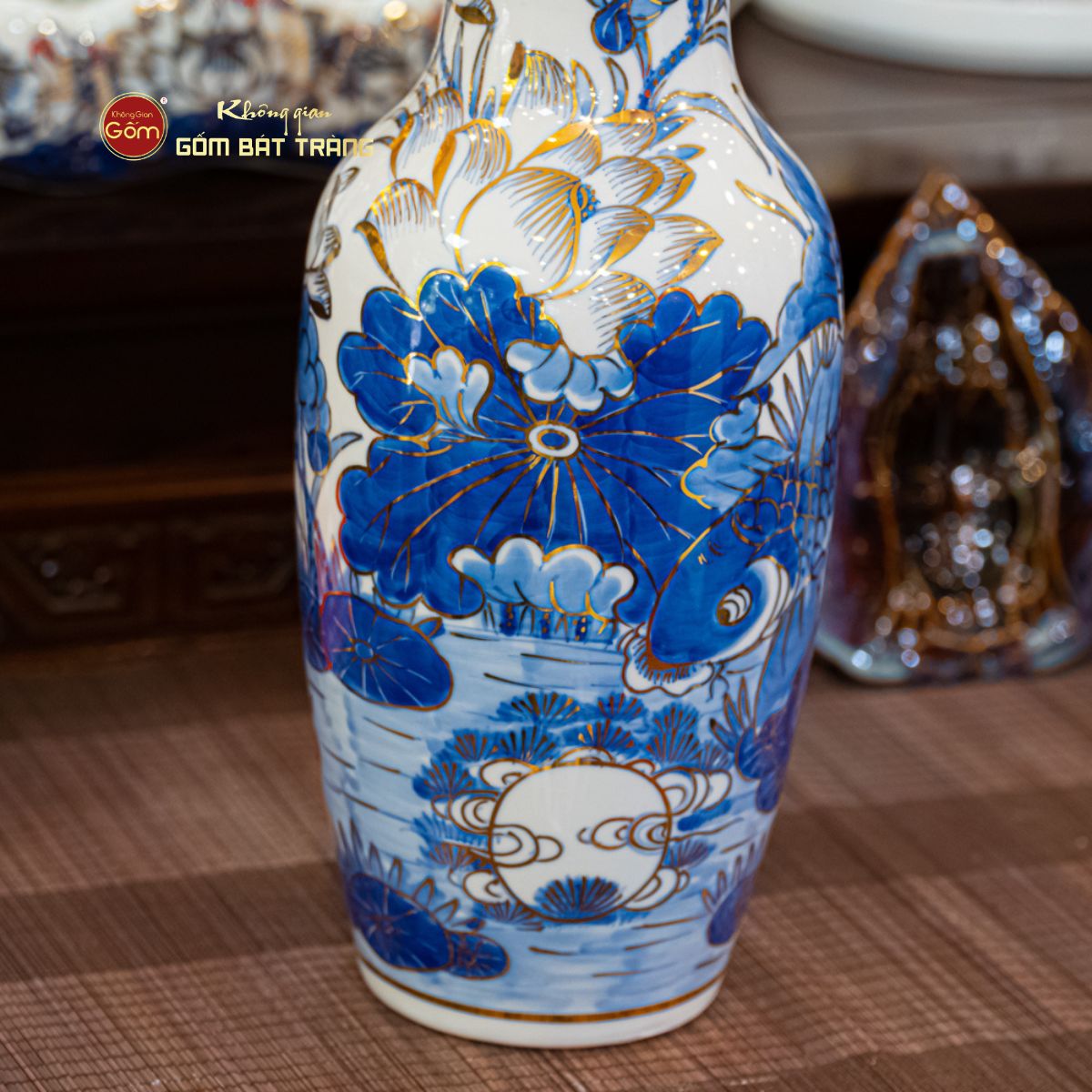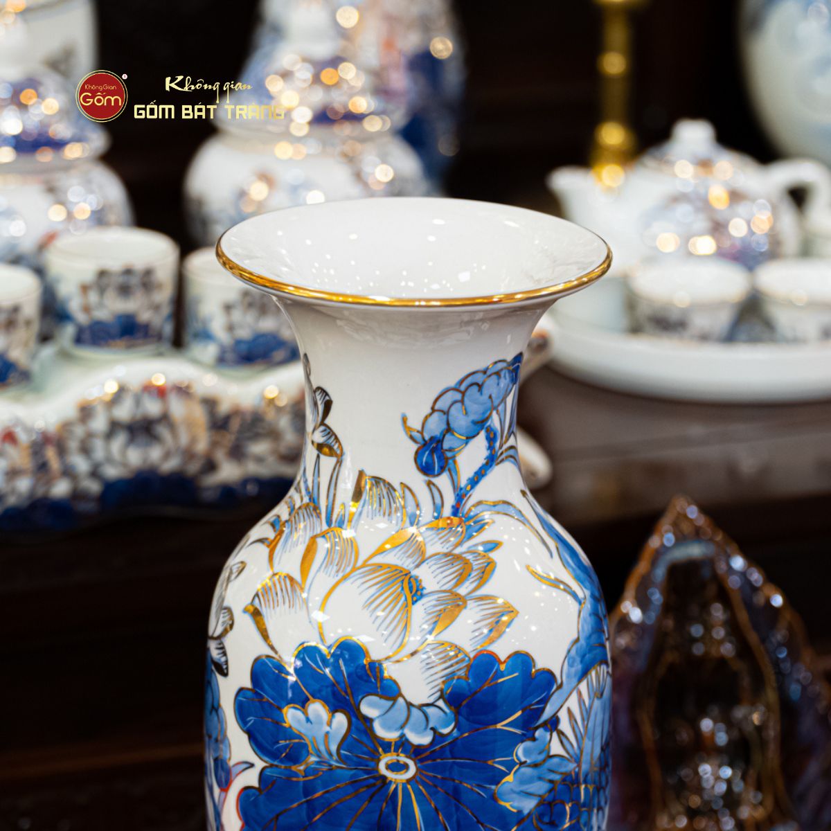 Địa Chỉ Mua Lọ Hoa Thờ Miệng Loe Men Lam Vẽ Vàng Họa Tiết Hoa Sen Tại Tp.HCM