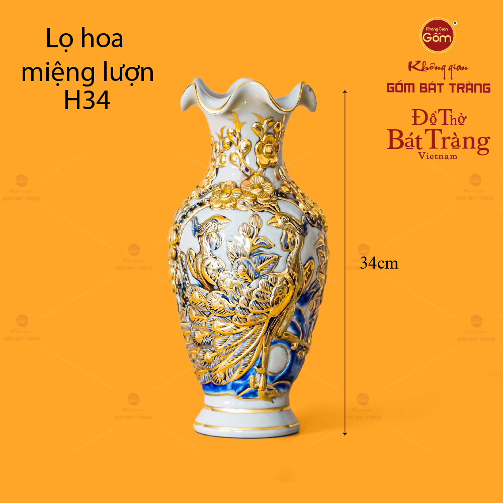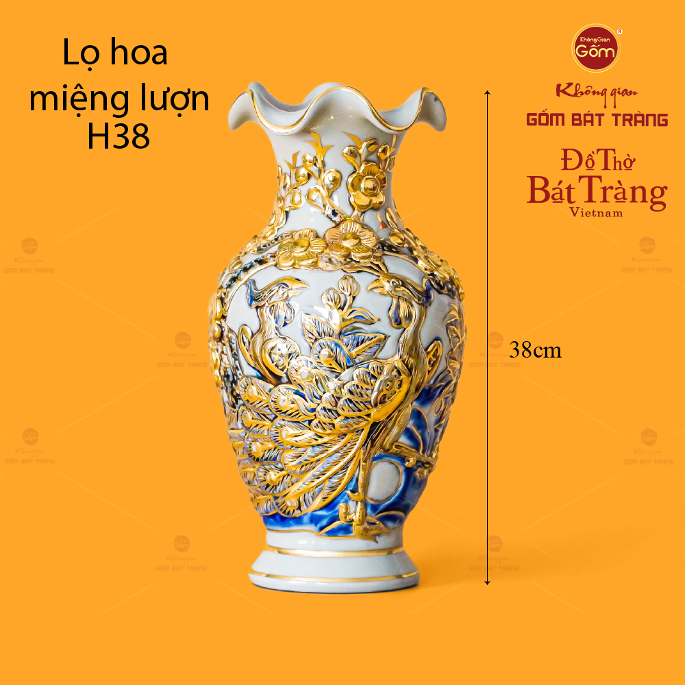 Lọ Hoa Thờ Miệng Lượn Men Hoàng Tộc Vẽ Vàng Họa Tiết Công Đào là một vật phẩm thờ cúng đầy tinh tế và sang trọng, được chế tác thủ công bởi những nghệ nhân lành nghề của làng gốm Bát Tràng. Sản phẩm này không chỉ là một chiếc lọ cắm hoa thông thường mà còn là một tác phẩm nghệ thuật gốm sứ độc đáo, mang vẻ đẹp quý phái, uy nghi và những giá trị tâm linh sâu sắc, thể hiện sự thành kính và mong ước về sự đủ đầy, may mắn, hạnh phúc cho gia đình. Với sự kết hợp hoàn hảo giữa kiểu dáng miệng lượn mềm mại, lớp men hoàng tộc cao cấp, họa tiết công đào sống động được vẽ vàng thủ công tinh xảo, chiếc lọ hoa này hứa hẹn sẽ làm bừng sáng không gian thờ cúng của gia đình bạn, tạo nên vẻ đẹp trang nghiêm, đẳng cấp và tràn đầy vượng khí.