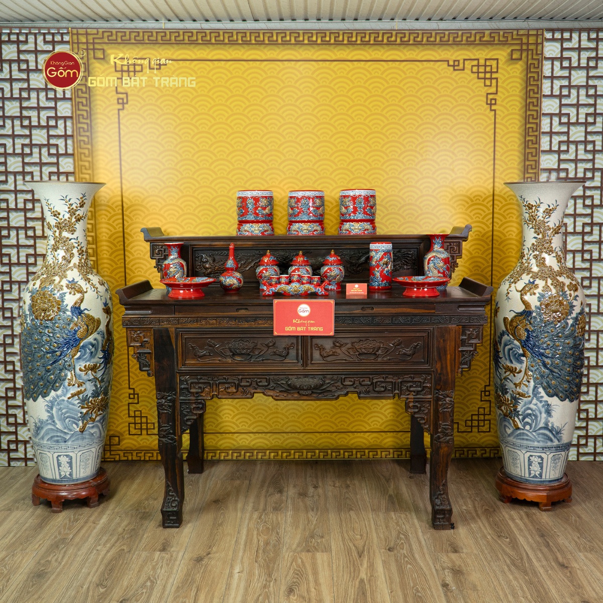 Cặp lộc bình có chiều cao 1m4, dáng bình thon gọn, thân nở hài hòa, cổ loe mềm mại tạo nên sự cân đối. Bình được nung chín kỹ, nhiệt độ lò nung cao đã tôi luyện nên chất gốm cứng cáp, chịu lực tốt và lớp men bền màu, không bong tróc hay phai màu theo thời gian. Phần đế chắc chắn giúp bình đứng vững, phù hợp để trưng bày ở những vị trí cố định như phòng khách lớn, sảnh nhà, phòng thờ hoặc nhà thờ họ.
