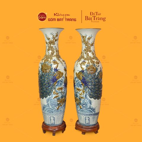 Lộc bình men rạn, trên nền là hoạ tiết chim công, hoa đào đắp nổi tạo sự sống động cho bề mặt bình. Sản phẩm phù hợp để trưng bày cố định tại không gian rộng như phòng khách lớn, biệt thự, nhà thờ họ hoặc các không gian tâm linh cần sự trang nghiêm. Chất liệu đất sét tuyển chọn, quy trình nung ở nhiệt độ cao giúp thân bình chắc, bền, có khả năng giữ màu men ổn định theo thời gian.