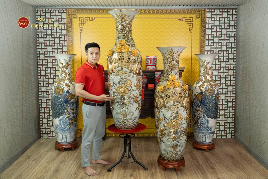 Cặp lộc bình gốm sứ có chiều cao 1m4, dáng bình thon gọn, thân nở hài hòa, cổ loe mềm mại tạo nên sự cân đối. Chân đế chắc chắn giúp bình đứng vững, phù hợp để trưng bày ở những vị trí cố định như phòng khách lớn, sảnh nhà, phòng thờ hoặc nhà thờ họ.