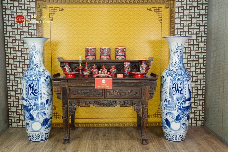 Chân đế lộc bình gốm sứ được làm chắc chắn, phù hợp để trưng bày cố định tại không gian rộng như phòng khách lớn, biệt thự, nhà thờ họ hoặc các không gian tâm linh cần sự trang nghiêm. Chất liệu đất sét tuyển chọn, quy trình nung ở nhiệt độ cao giúp thân bình chắc, bền, có khả năng giữ màu men ổn định theo thời gian.