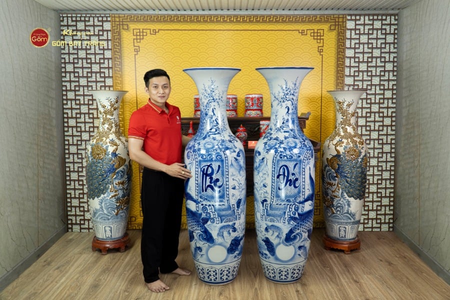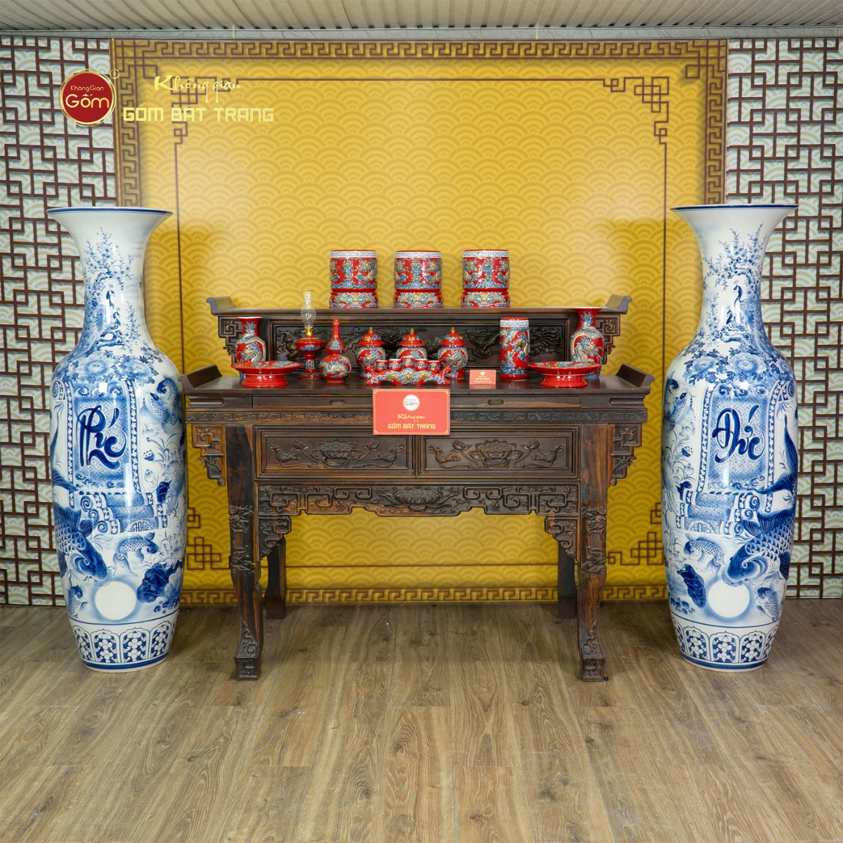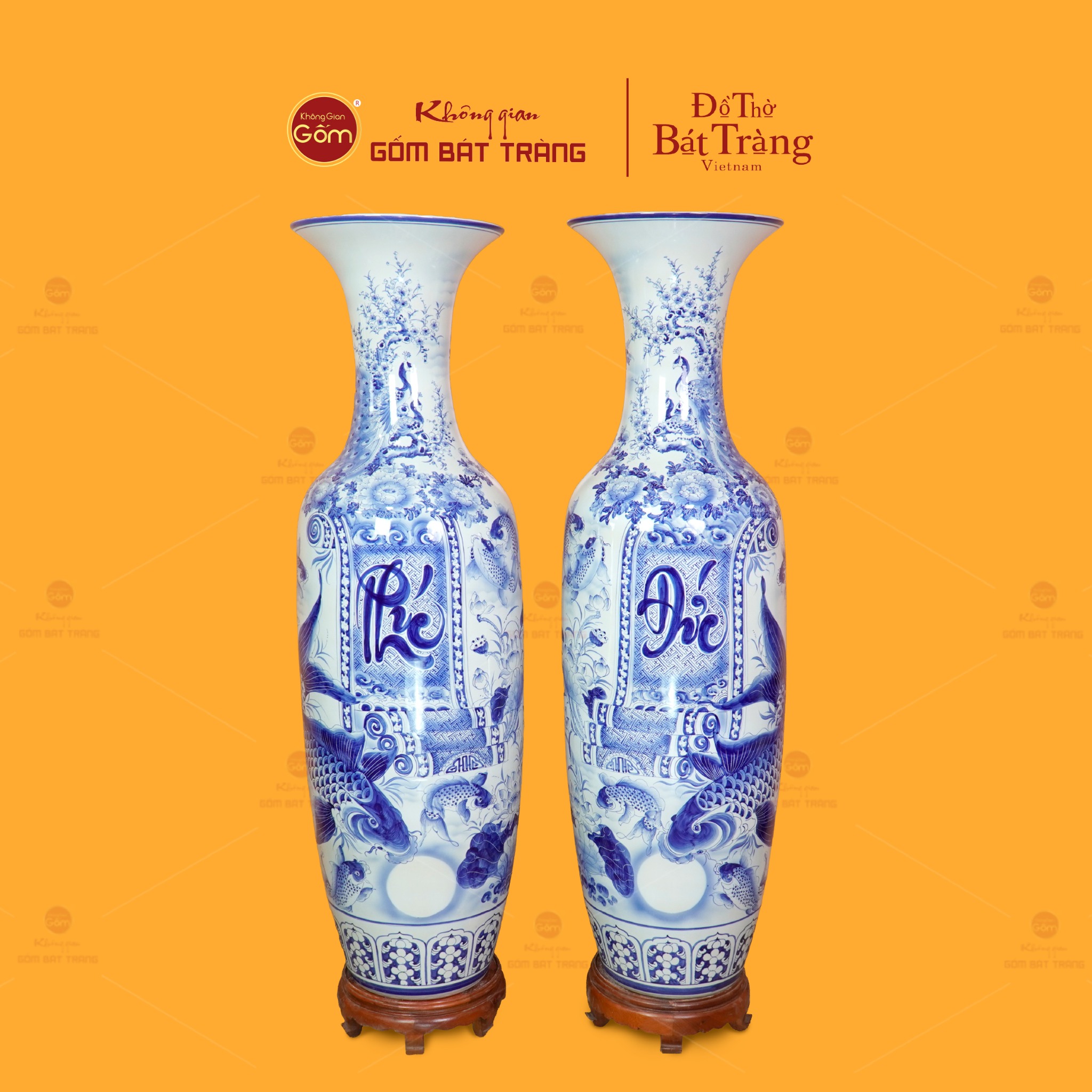 Lộc Bình 1M6 Men Lam Họa Tiết Phúc Đức Công Ngư Hội Tụ là cặp đôi lộc bình men lam có hoạ tiết men lam đẹp mắt và đậm chất truyền thống. Lộc bình men lam luôn mang trong mình vẻ đẹp hài hòa và tinh tế, được xem là biểu tượng cát tường, mang lại tài vận hanh thông, may mắn dồi dào và sự phát đạt bền vững cho gia chủ. Sản phẩm là một trong những thiết kế tiêu biểu của dòng gốm Bát Tràng truyền thống. Từng họa tiết được khắc họa với độ trân trọng cao, giữ được tinh thần mộc mạc, gần gũi nhưng vẫn toát lên sự trang nghiêm phù hợp với không gian thờ tự, phòng khách hoặc sảnh trưng bày của gia đình.