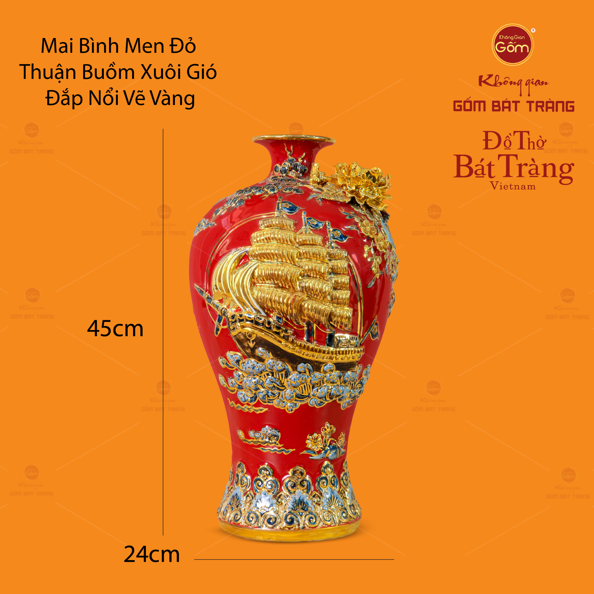 Mai Bình Men Đỏ Thuận Buồm Xuôi Gió Đắp Nổi Vẽ Vàng là một kiệt tác gốm sứ Bát Tràng cao cấp, kết hợp hoàn hảo giữa nghệ thuật đắp nổi 3D tinh xảo và kỹ thuật vẽ vàng kim truyền thống. Với kiểu dáng mai bình đặc trưng - miệng loe, cổ thắt nhỏ, thân phình to cao 45cm, đường kính 24cm, sản phẩm không chỉ là vật phẩm phong thủy thu hút và giữ gìn tài lộc mà còn là biểu tượng của sự thành công, may mắn và thuận lợi trong mọi công việc. Đây là món quà hoàn hảo dành tặng trong các dịp khai trương, khởi nghiệp, tân gia, thăng chức, thể hiện lời chúc về sự nghiệp thăng hoa và tài lộc dồi dào.