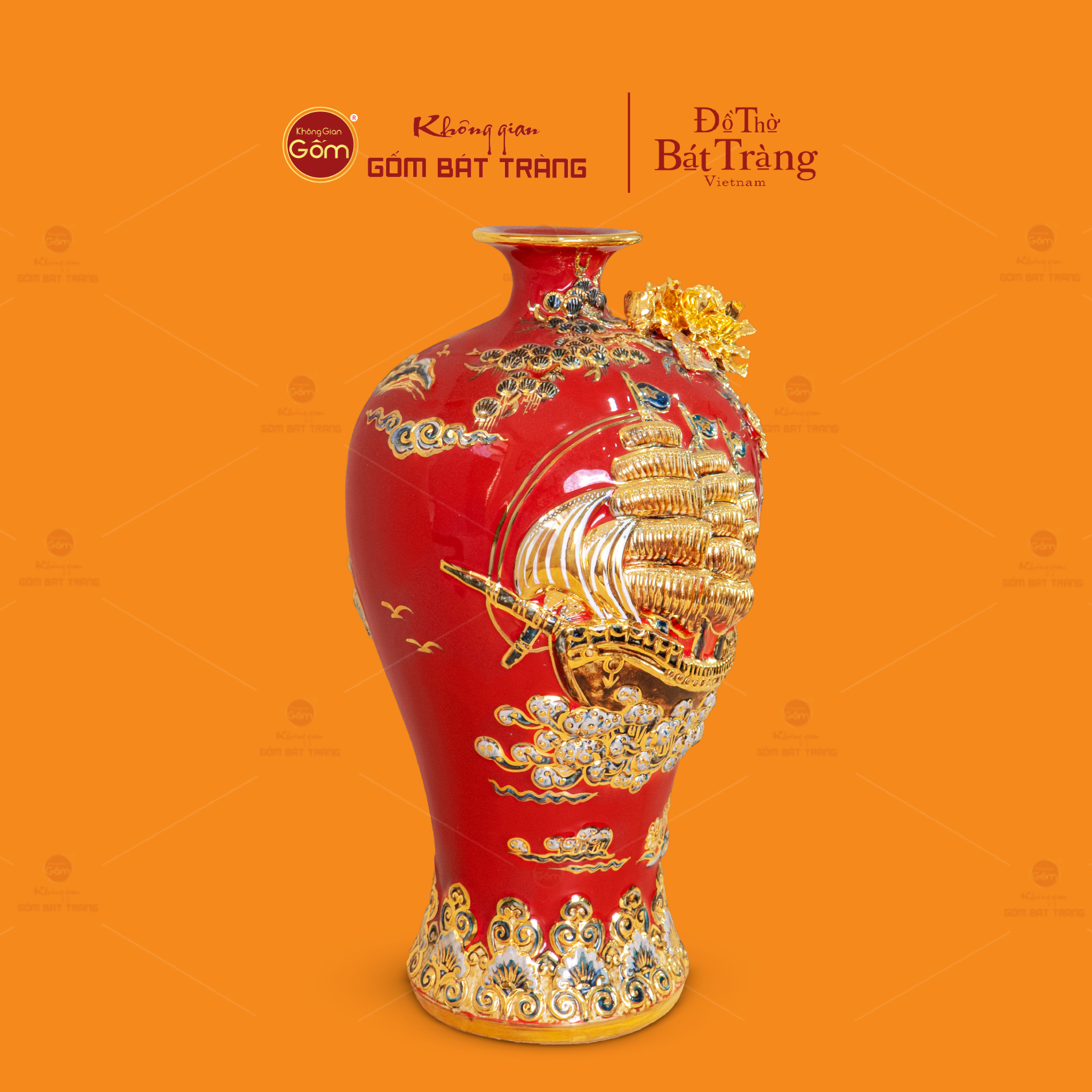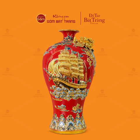 Mai Bình Men Đỏ Thuận Buồm Xuôi Gió Đắp Nổi Vẽ Vàng thuộc dòng sản phẩm gốm sứ phong thủy cao cấp của làng gốm Bát Tràng, được chế tác từ đất sét trắng tinh luyện, nung ở nhiệt độ trên 1300°C để đạt độ sứ hoá hoàn hảo, đảm bảo độ bền vượt trội và khả năng giữ màu men lâu dài theo thời gian.