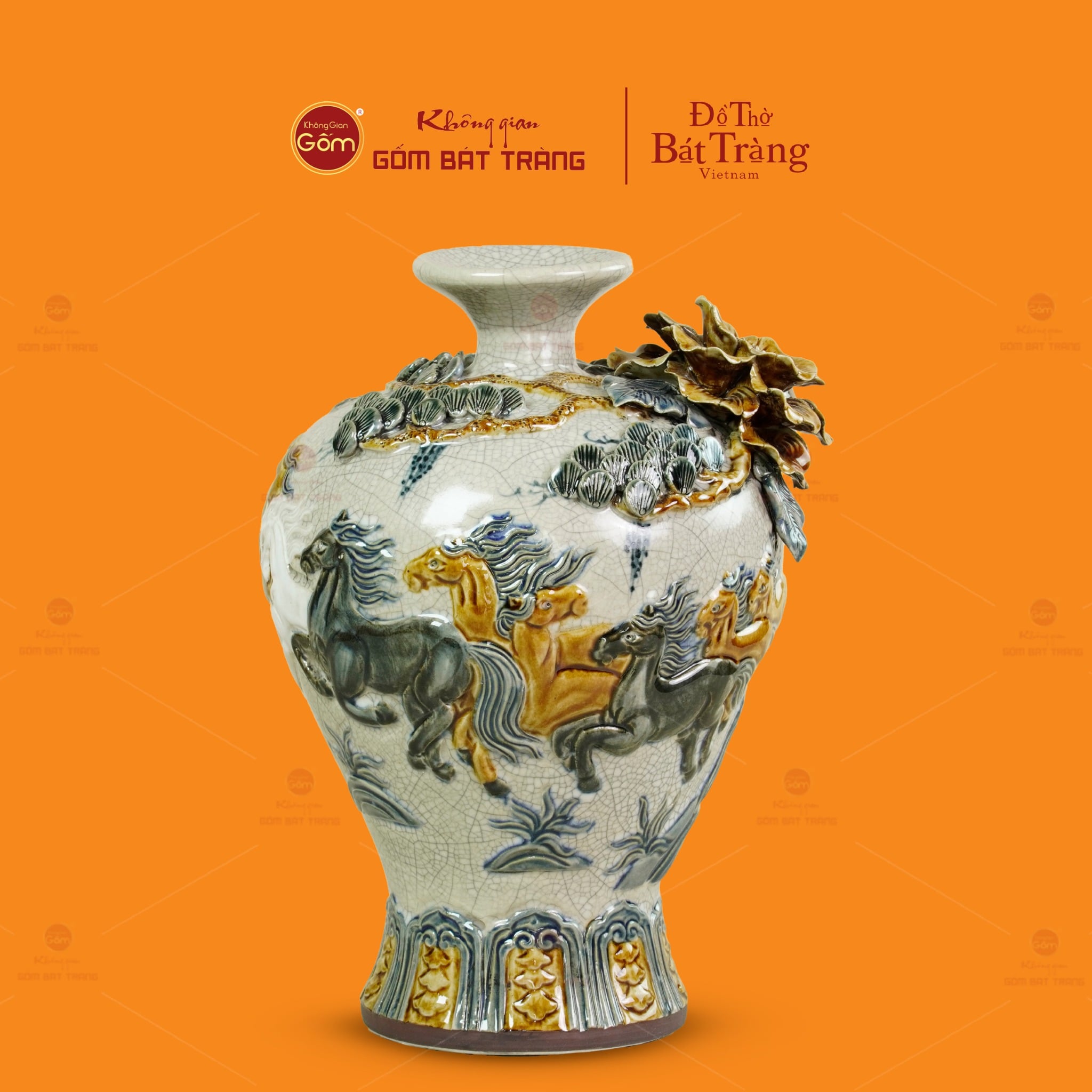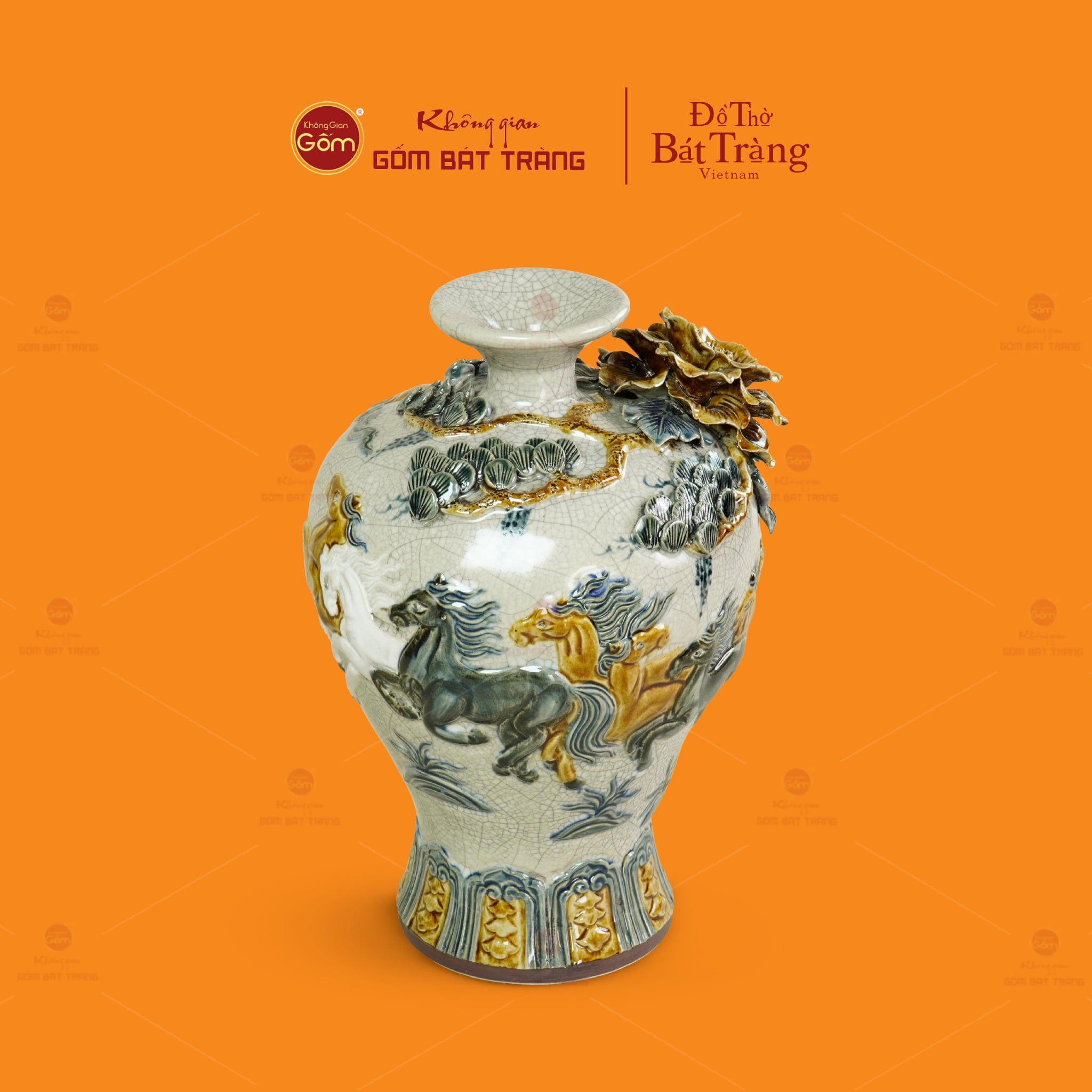 | Tên sản phẩm: | Mai Bình Men Rạn Đắp Nổi Họa Tiết Bát Mã |