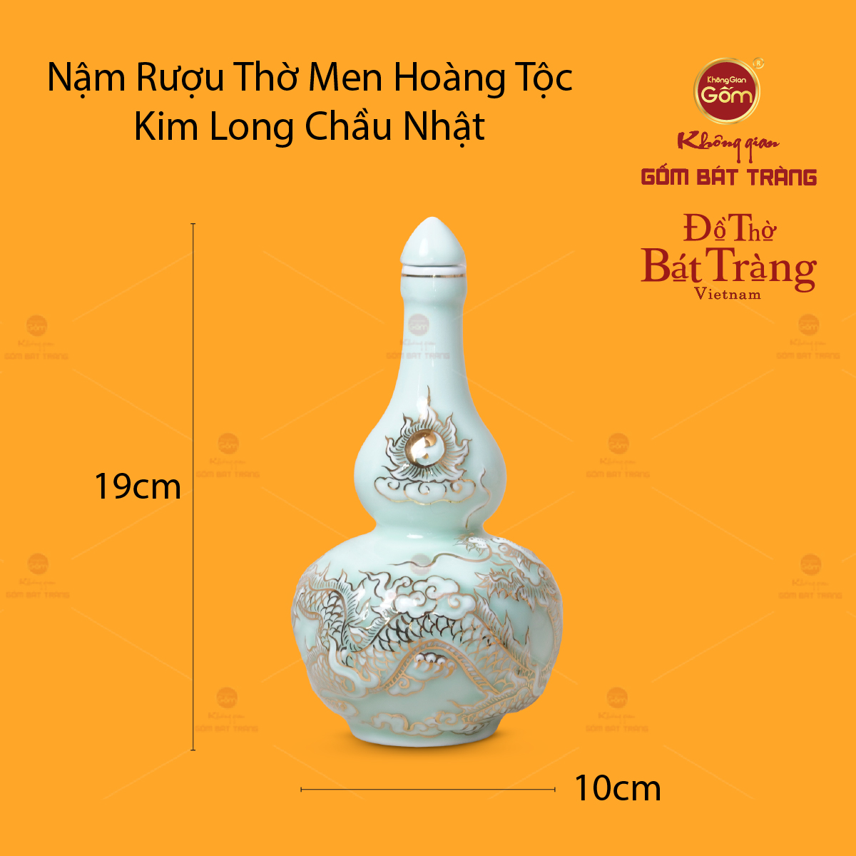 Nậm Rượu Men Ngọc Hoàng Tộc Kim Long Chầu Nhật Vẽ Vàng là vật phẩm thờ cúng mang giá trị thẩm mỹ và tâm linh cao, được chế tác thủ công tại làng nghề gốm Bát Tràng. Sản phẩm thuộc dòng men ngọc hoàng tộc cao cấp, sở hữu sắc men thanh nhã, trong sáng, kết hợp họa tiết kim long chầu nhật đắp nổi vẽ vàng tinh xảo. Nậm rượu không chỉ dùng để đựng rượu thờ trong các nghi lễ truyền thống mà còn góp phần hoàn thiện sự trang nghiêm, chuẩn mực và linh thiêng cho không gian thờ gia tiên, bàn thờ thần linh của mỗi gia đình Việt.
