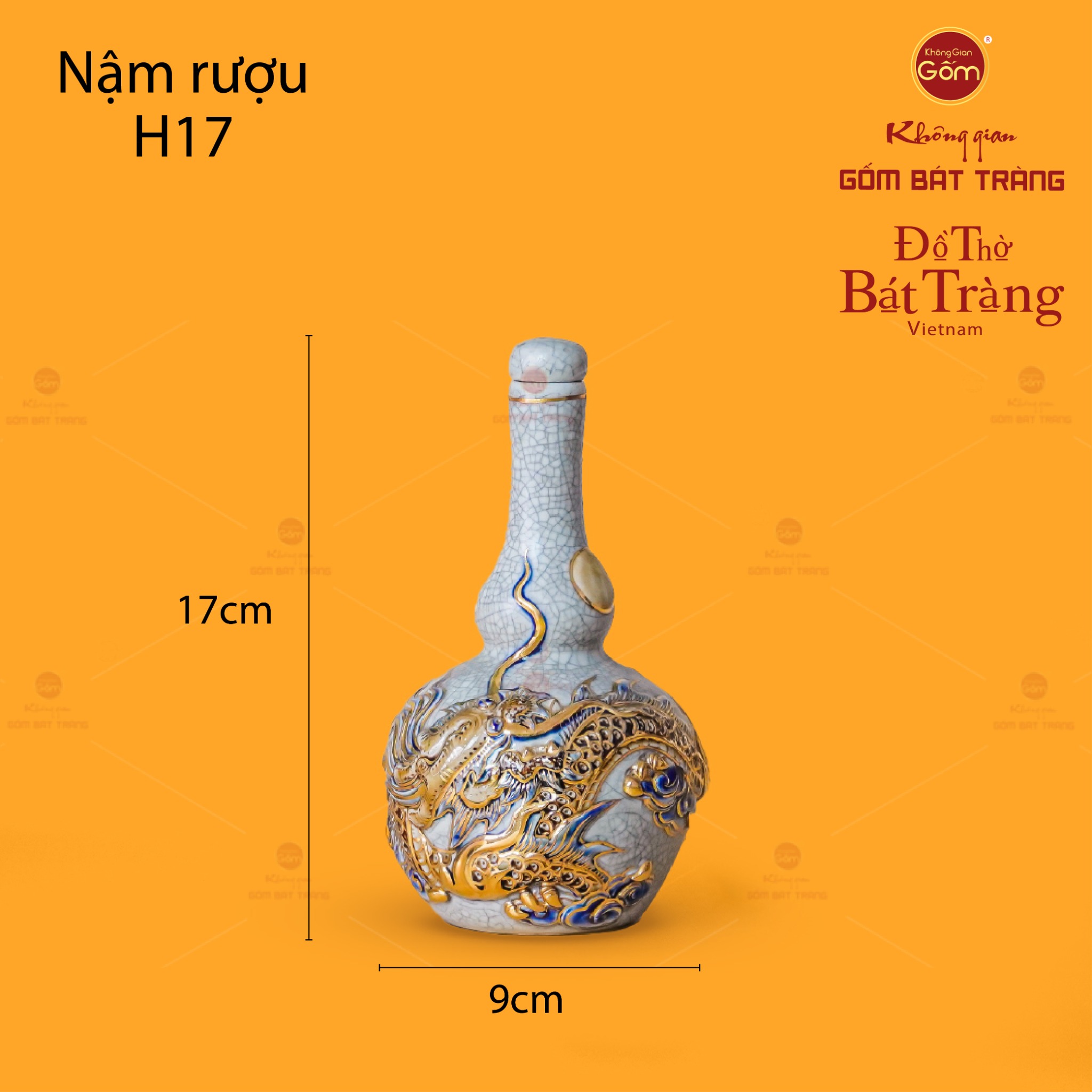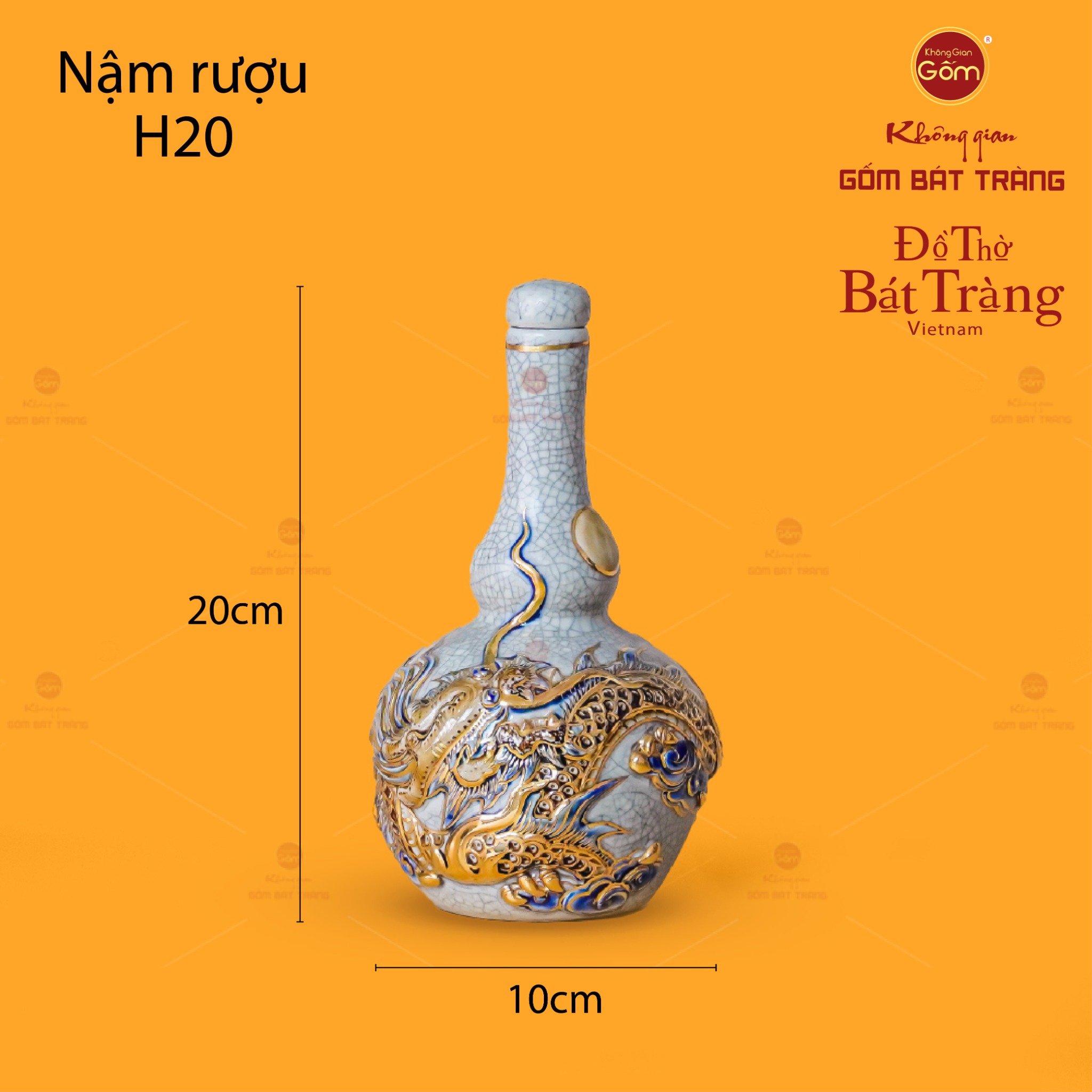 | Tên sản phẩm: | Nậm Rượu Thờ Kim Long Chầu Nhật Men Rạn Vẽ Vàng |