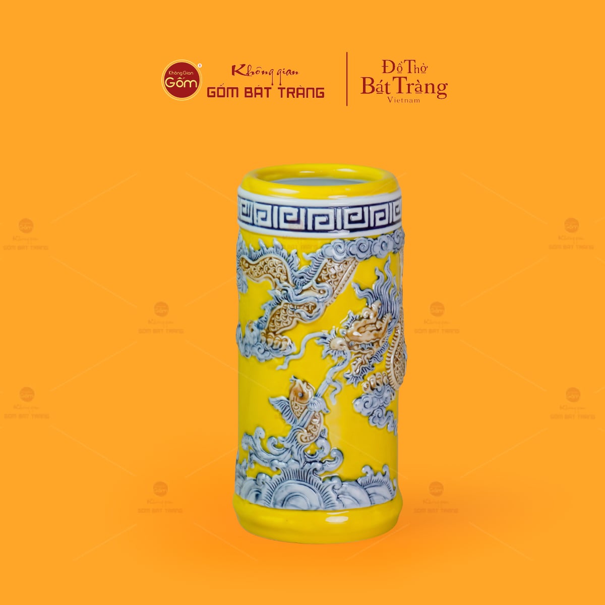 Ống hương được chế tác hoàn toàn thủ công từ đất sét Bát Tràng chọn lọc kỹ lưỡng, đem nung ở nhiệt độ cao để đạt được độ kết khối hoàn hảo và lớp men bền chắc. Men vàng đặc trưng của dòng gốm này có sắc ấm, ánh nhẹ, không quá rực rỡ nhưng vẫn thể hiện sự sang trọng và quyền quý. Dưới ánh sáng, men phản chiếu nhẹ nhàng, khiến họa tiết nổi bật mà vẫn giữ được vẻ trang nghiêm của không gian thờ cúng.