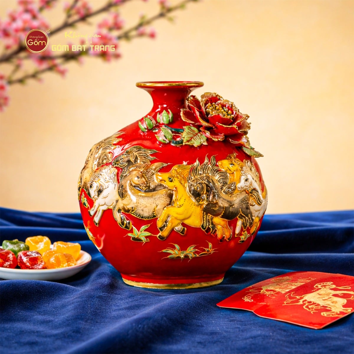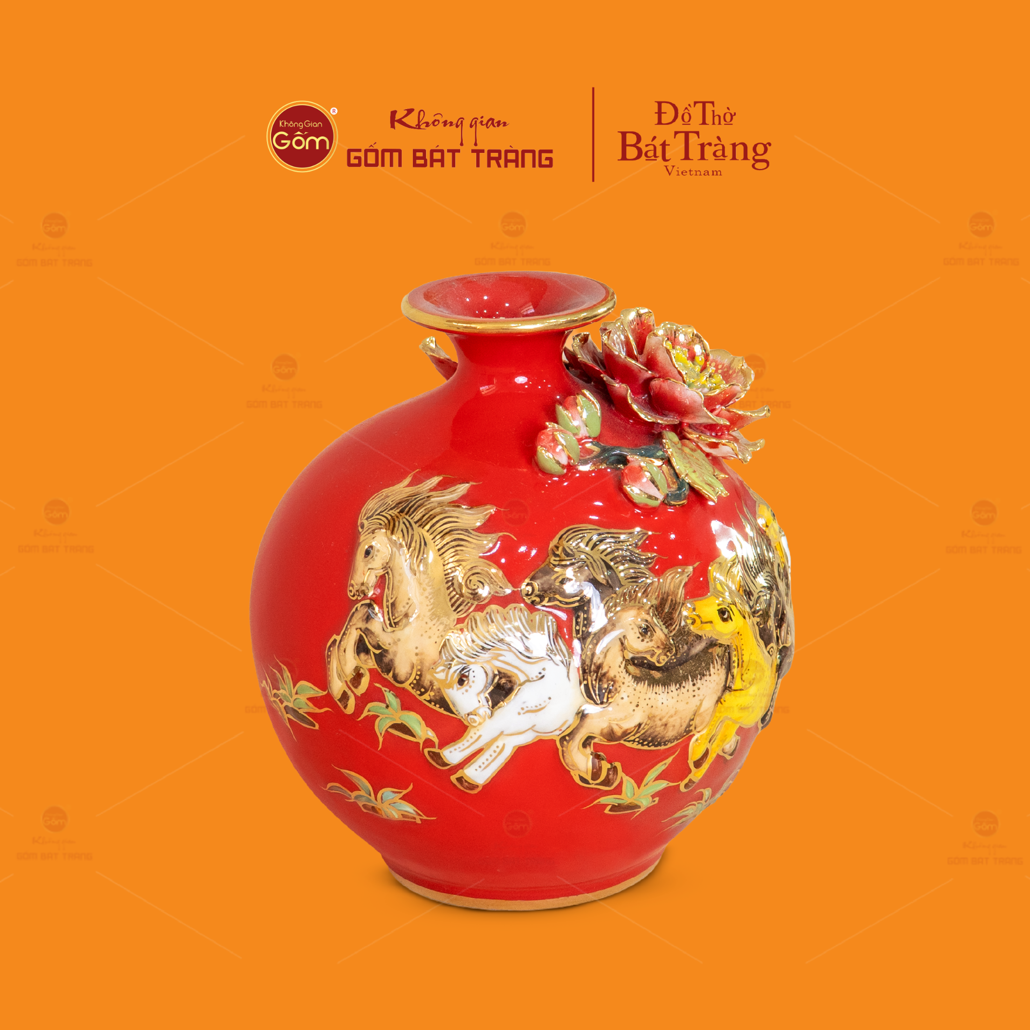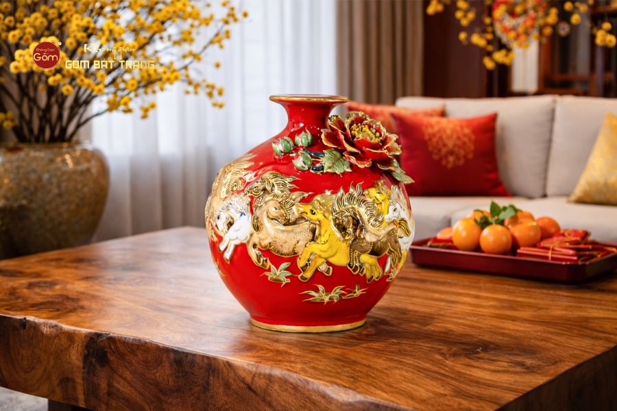 Điểm nhấn nghệ thuật đặc biệt của sản phẩm chính là hình ảnh đàn ngựa phi nước đại – biểu tượng quen thuộc của tranh phong thủy “Mã Đáo Thành Công”. Từng chú ngựa được đắp nổi thủ công, tạo hiệu ứng 3D sống động, nổi bật trên nền men đỏ.