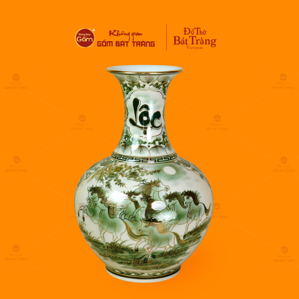 Bề mặt bình củ tỏi được phủ lớp men óng ánh, ánh sắc vàng xanh chuyển giao tự nhiên theo từng góc nhìn, mang đến cảm giác sang trọng, quyền quý. Các họa tiết Mã Đáo Thành Công – Thuận Buồm Xuôi Gió được vẽ tay hoàn toàn bằng vàng kim, từng nét bút mềm mại, sắc sảo thể hiện sự tỉ mỉ và tâm huyết của nghệ nhân Bát Tràng.