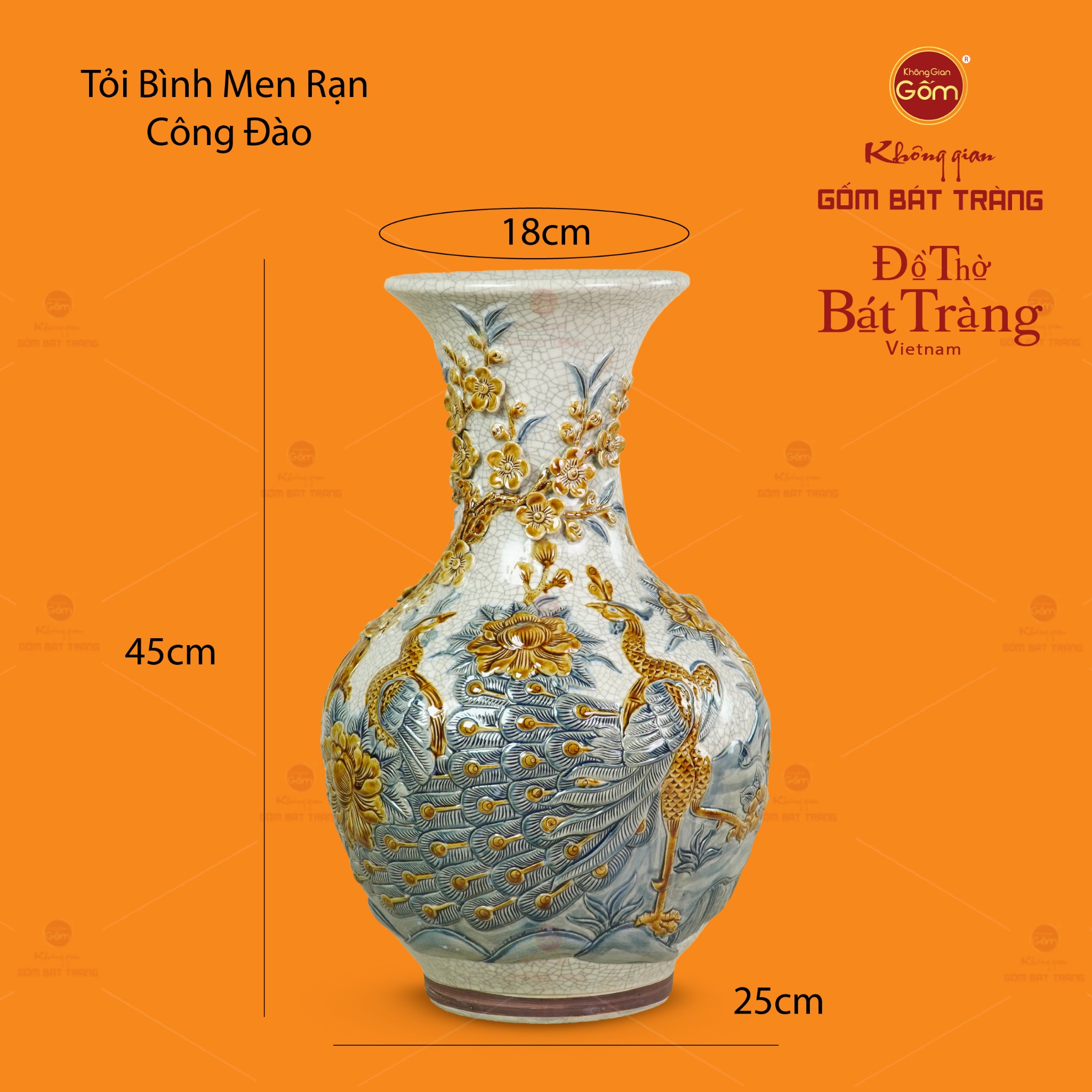 Sản phẩm được nung ở nhiệt độ cao, đảm bảo xương gốm đanh chắc, bề mặt men bền màu và ít chịu ảnh hưởng của môi trường. Tỏi Bình Men Rạn Đắp Nổi Họa Tiết Công Đào Hoa phù hợp để trưng bày độc lập hoặc kết hợp cùng các dòng mai bình, lộc bình men rạn để tạo nên không gian thống nhất và sang trọng.