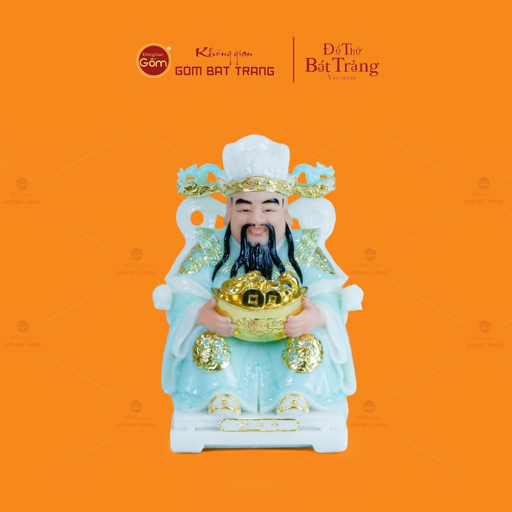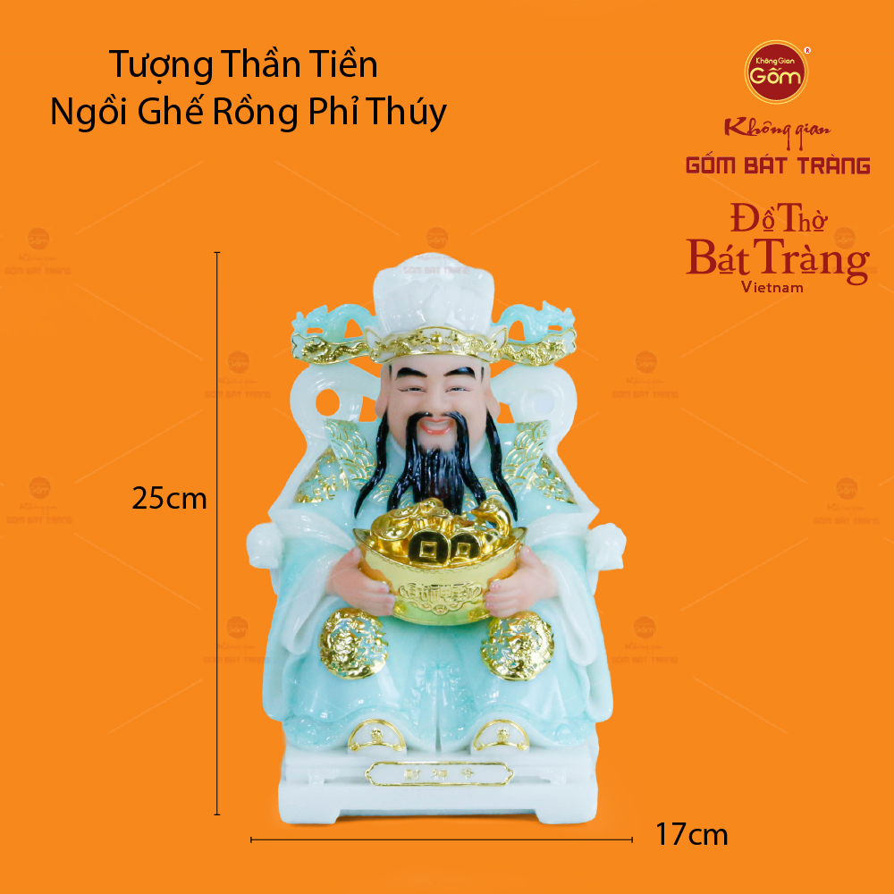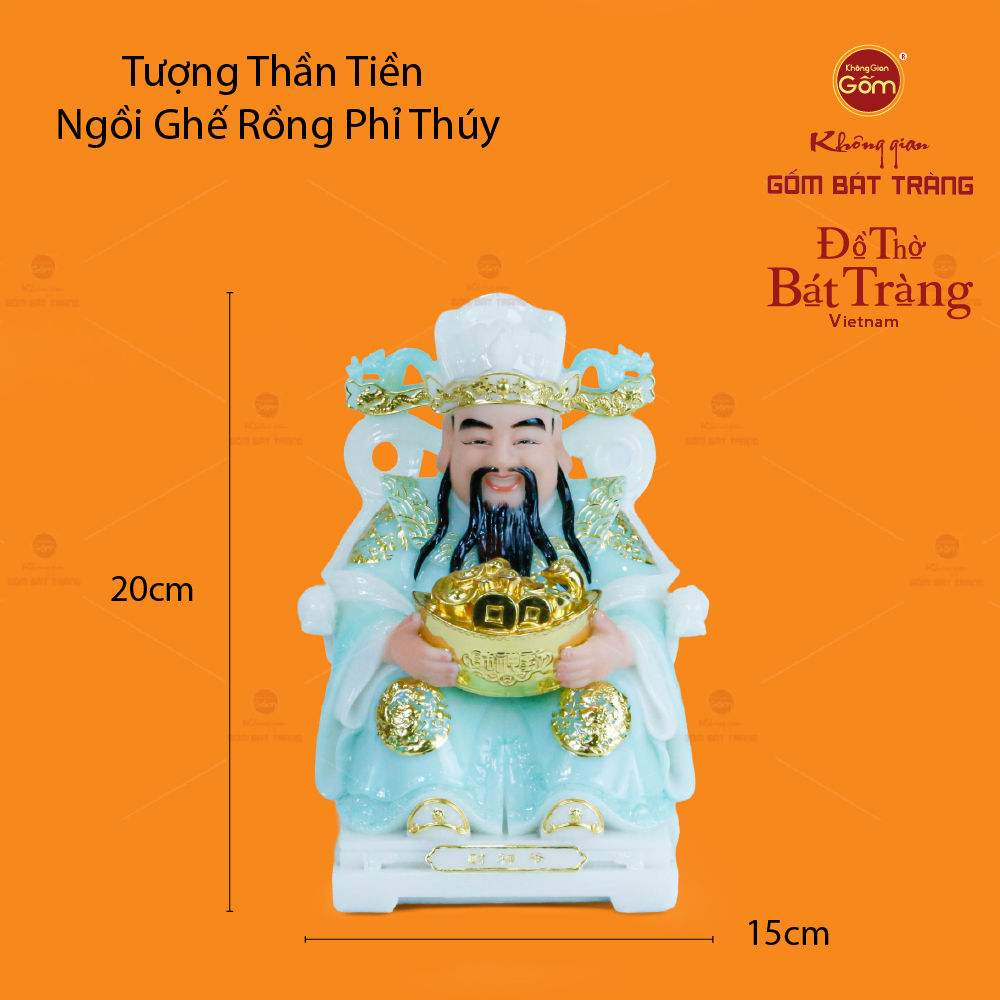Tượng được chế tác từ gốm sứ Bát Tràng cao cấp, phủ lớp men phỉ thúy mịn màng, tạo cảm giác thanh khiết và sang trọng. Gam màu xanh phỉ thúy không chỉ đẹp mắt mà còn gợi liên tưởng đến sự tươi mới, phát triển và trường tồn. Các chi tiết trên tượng, từ ghế rồng quyền uy cho đến bộ áo choàng của Thần Tiền, đều được mạ vàng tinh xảo, nổi bật trên nền men xanh, tạo nên sự hài hòa và đẳng cấp.